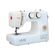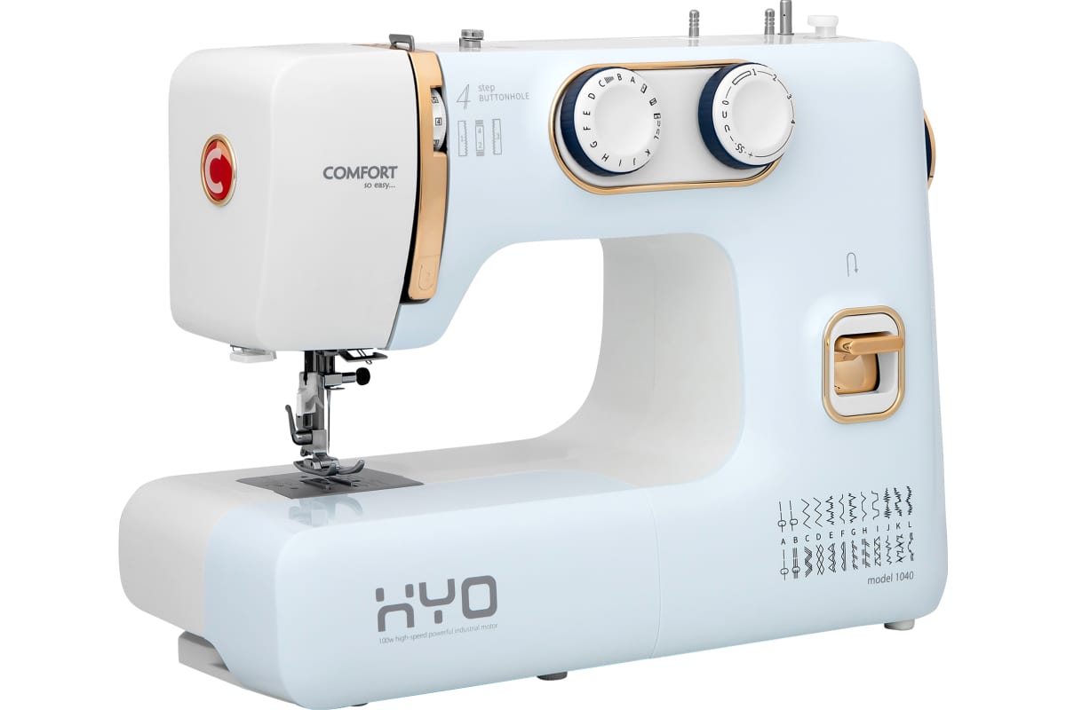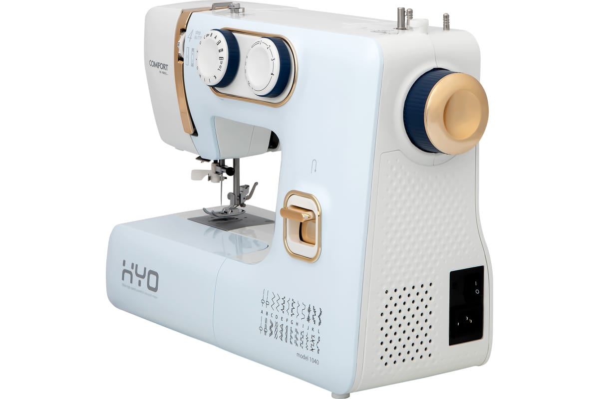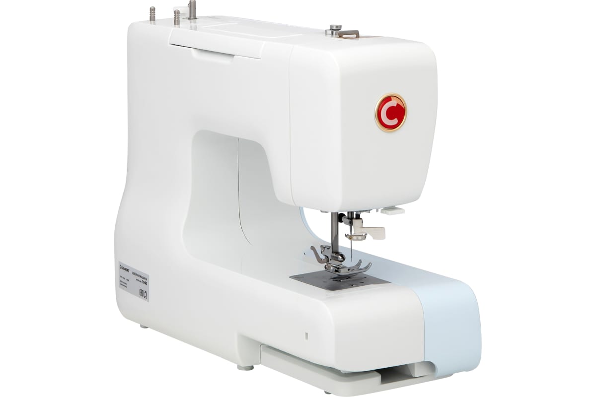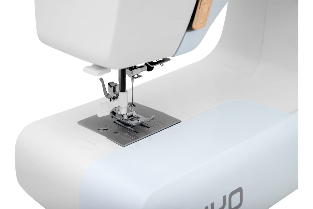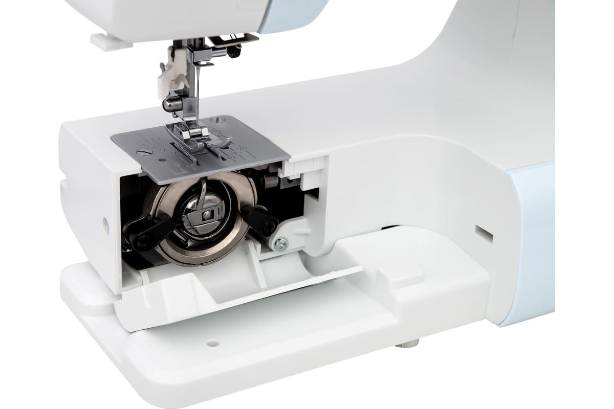 Швейная машина голубого цвета выполнена в высокопрочном пластиковом корпусе с вертикально расположенной катушкой, механизмом для вдевания нити, нитеобрезателем и светодиодной подсветкой. Модель с габаритами 29х37х15 см и весом 6 кг отличается устойчивым основанием с прорезиненными ножками и ручкой для переноски.