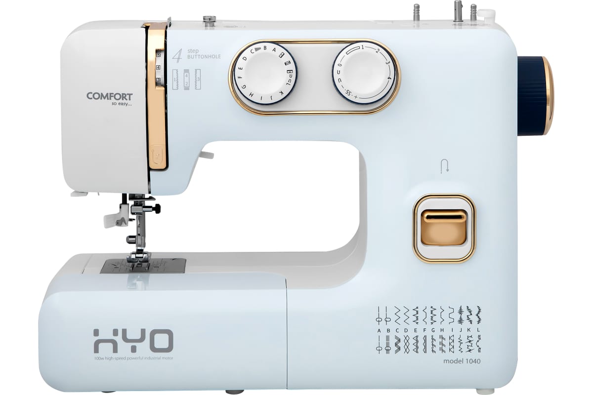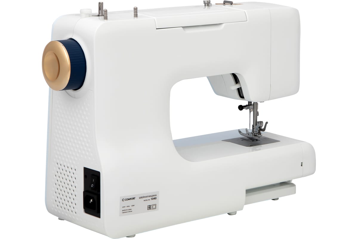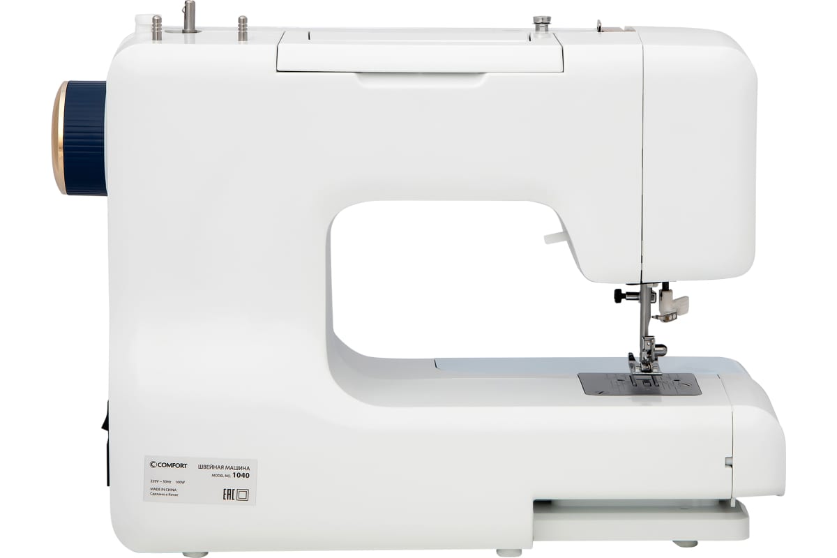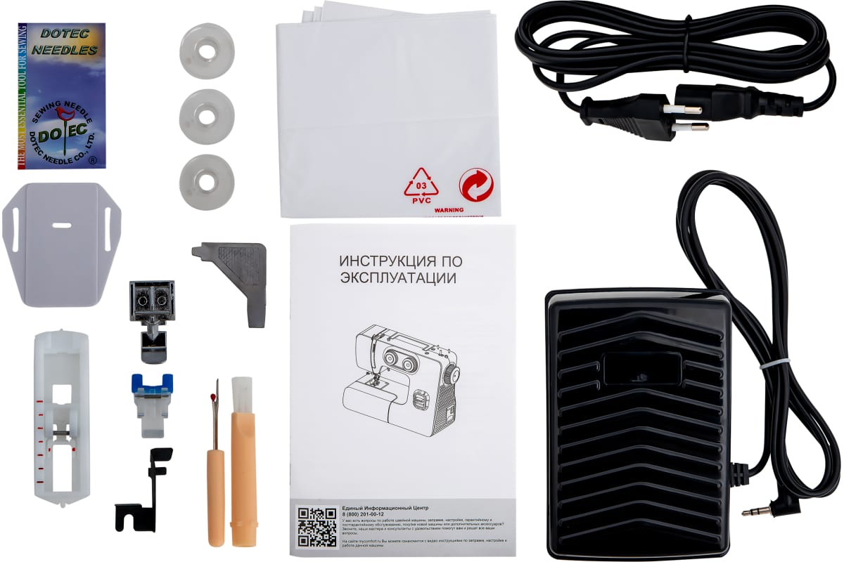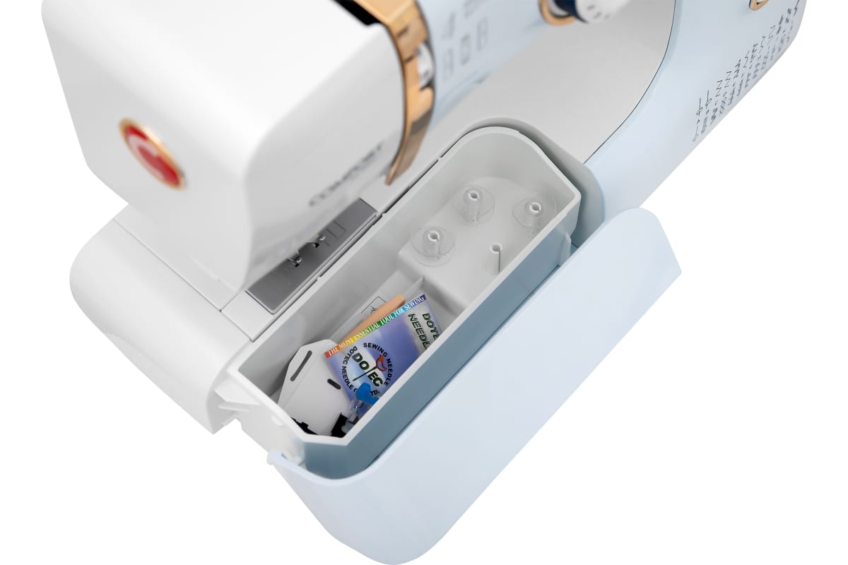 Снизу расположен отсек для хранения аксессуаров. В комплектацию входят металлический челнок, три пластиковые шпульки, вспарыватель, набор игл 130/705H, отвертка, штопательная пластина, щеточка для чистки и четыре лапки — стандартная, для выметывания, вшивания молний и пришивания пуговиц. Устройство мощностью 100 Вт поставляется с отсоединяемым шнуром питания и педалью с кабелем длиной 1,4 м.