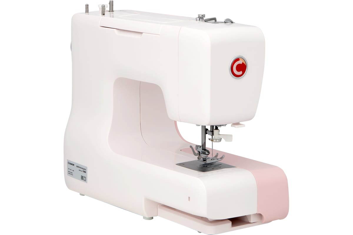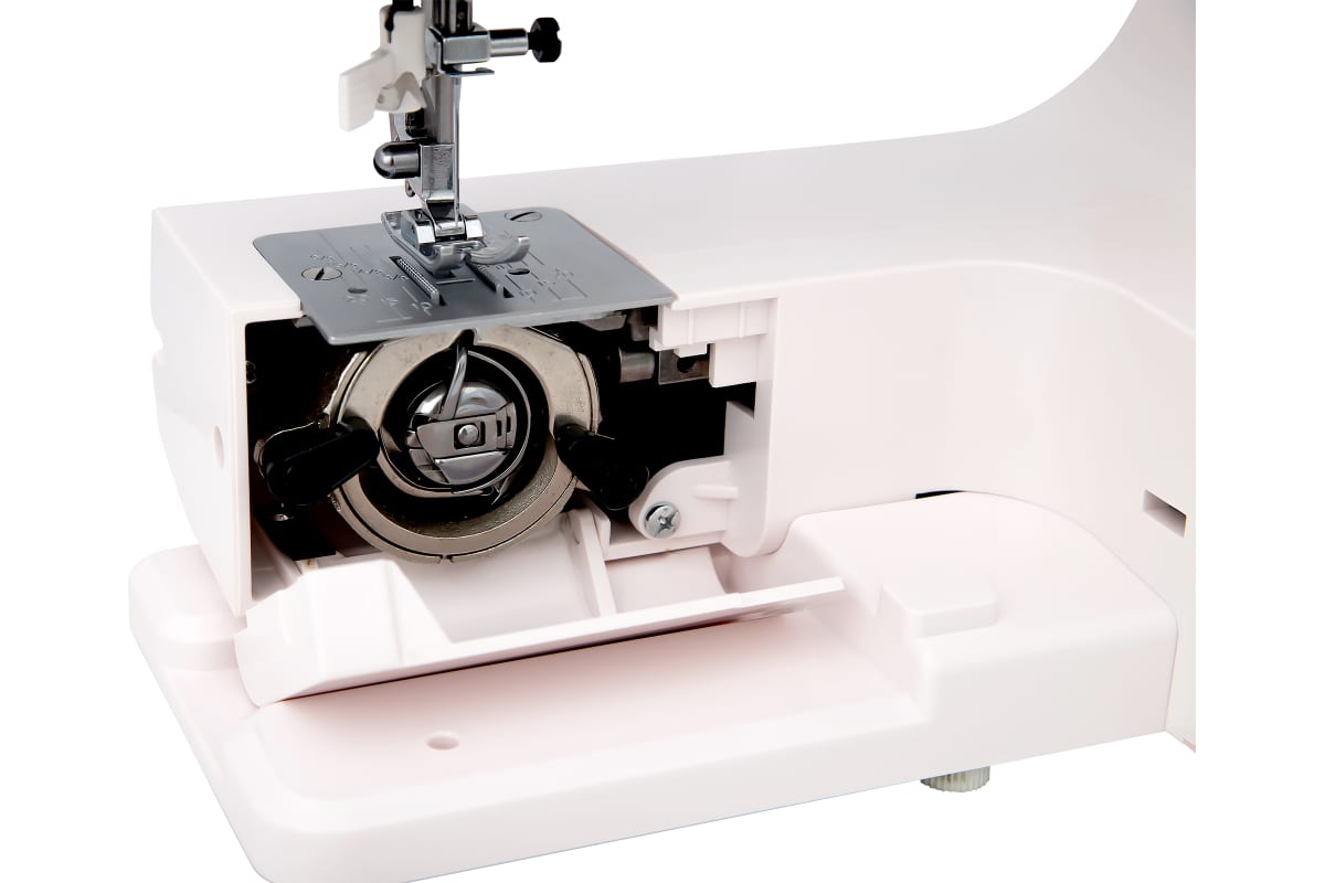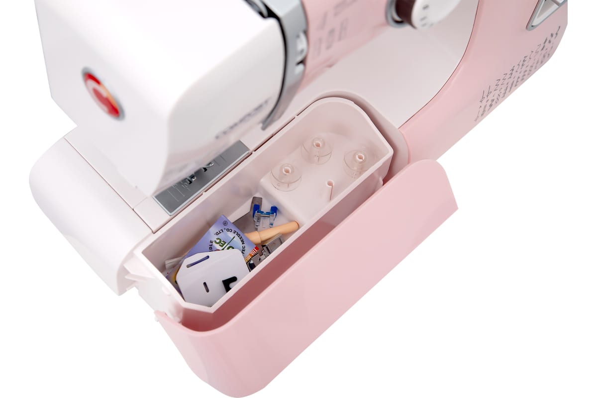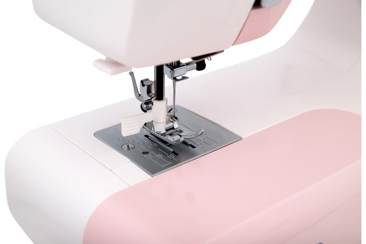 Швейная машина розового цвета идет в комплекте с четырьмя лапками и тремя шпульками. Длина стежка регулируется от 1 до 4 мм. Габариты модели — 29х37х15 см. Вес изделия — 6 кг. Присутствует светодиодная подсветка рабочей зоны. Скорость шитья достигает 650 стежков в минуту. Корпус сделан из прочного легкого пластика, оснащен нитеобрезателем и удобной ручкой для переноски. Прорезиненные ножки не скользят по любой поверхности. Мощность прибора — 0,1 кВт. Вертикальный челнок сделан из прочного металла. Длина отсоединяемого шнура — 1,4 м.