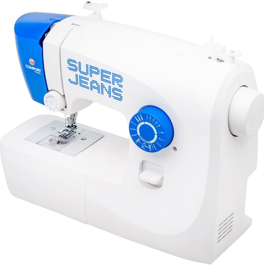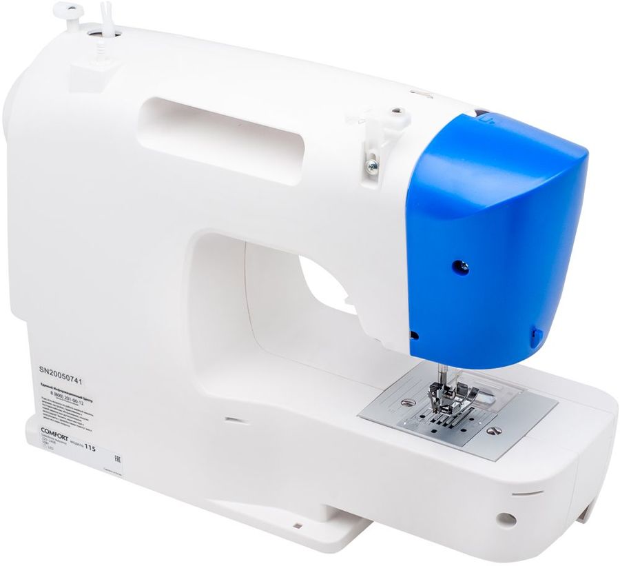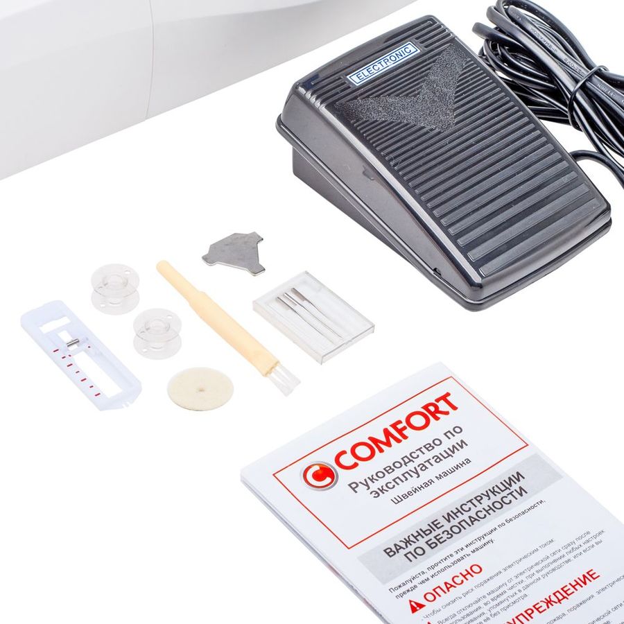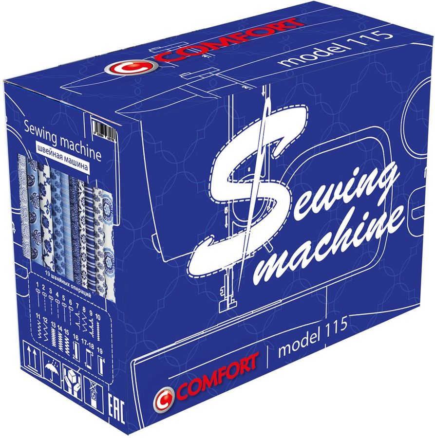 электромеханическая, кол-во строчек 19, челнок: горизонтальный, выполнение петель: полуавтоматическое, рукавная платформа, реверс, подсветка, ручка для переноски