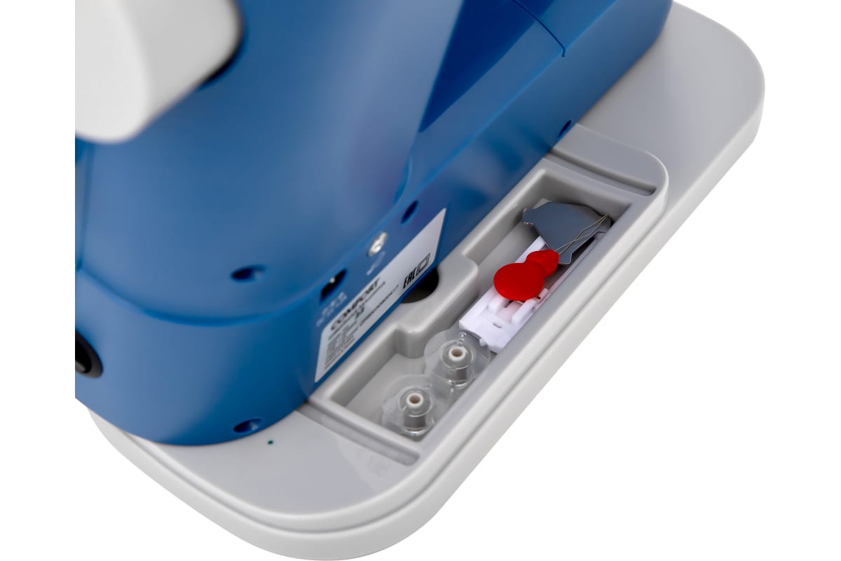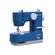 Швейная машина синего цвета идет в комплекте с тремя шпульками и стандартной лапкой. Скорость шитья достигает 350 стежков в минуту. Рабочая зона подсвечивается с помощью светодиодной лампочки. Габариты модели — 26х28х12 см. Вес изделия — 2,6 кг. Длина кабеля составляет 1,4 м. Мощность прибора — 7 Вт. Присутствует функция реверса. Лапка поднимается на 7 мм. Длина стежка регулируется до 4 мм. Корпус сделан из пластика, оснащен горизонтальной катушкой, нитеобрезателем, ручкой для переноски. Прорезиненные ножки не скользят по поверхности.
