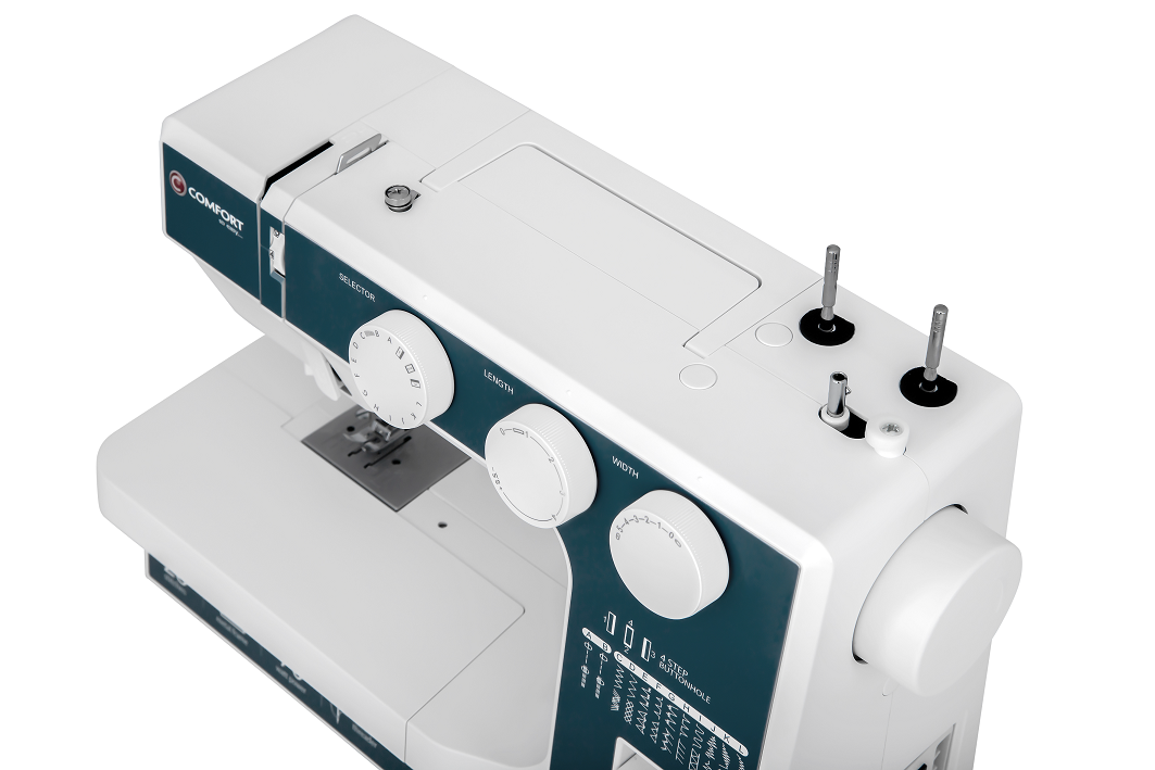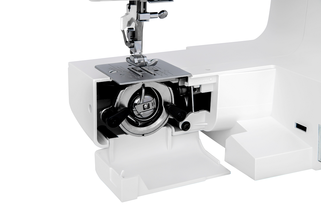 нитевдеватель, двойная игла, коленный рычаг подъема лапки, ручной обрезатель нити, отключение механизма подачи ткани (отключение зубчатой рейки)
