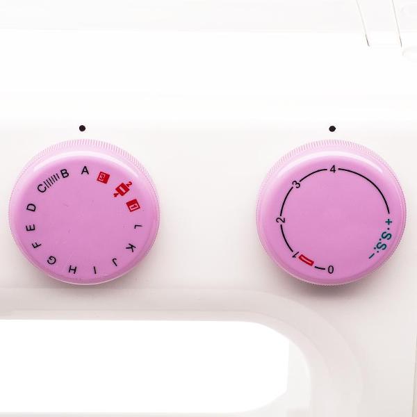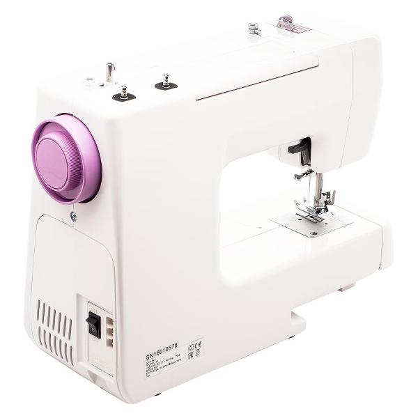 Швейная машина подключается к электросети, длина кабеля — 1,4 м. Мощность двигателя составляет 70 Вт. Корпус выполнен из пластика, ножки прорезинены, что гасит вибрацию и делает устройство более устойчивым. Поверхность педали рельефная — нога не будет соскальзывать. В комплект поставки входит набор аксессуаров, среди которых лапки, иглы, вспарыватель, отвертки и масло для ухода за машиной.