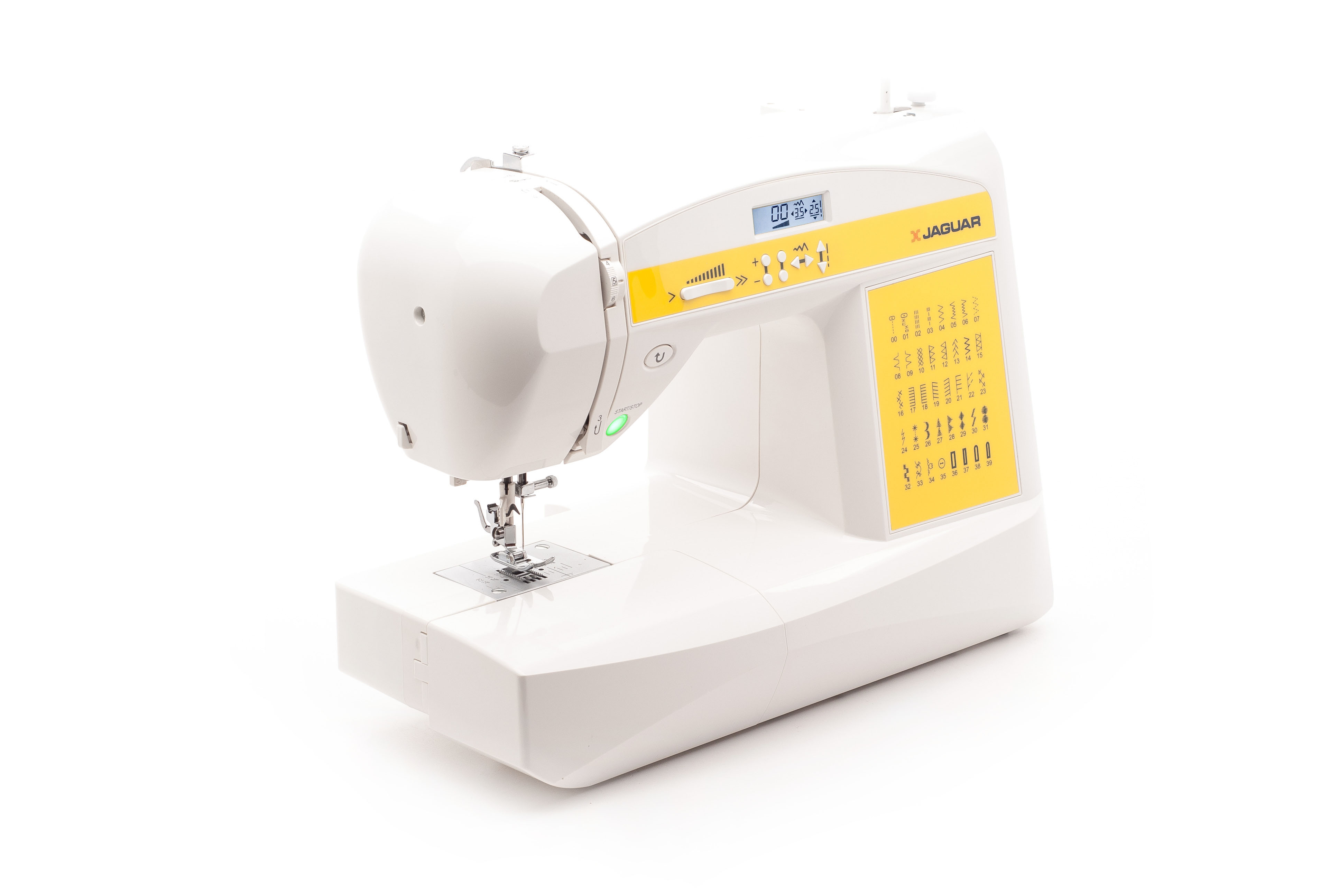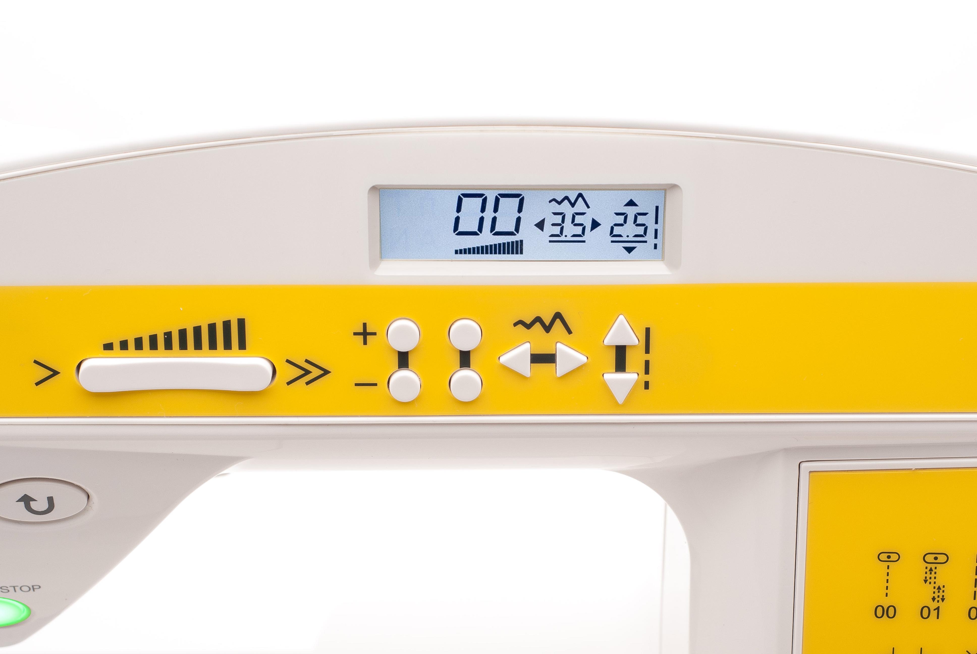 Электронные функции возможность шитья без педали, LCD (ЖК дисплей), стабилизатор усилия прокола, остановка иглы в верхнем положении, вертикальный позиционер иглы, электронный горизонтальный позиционер, электронный швейный советник