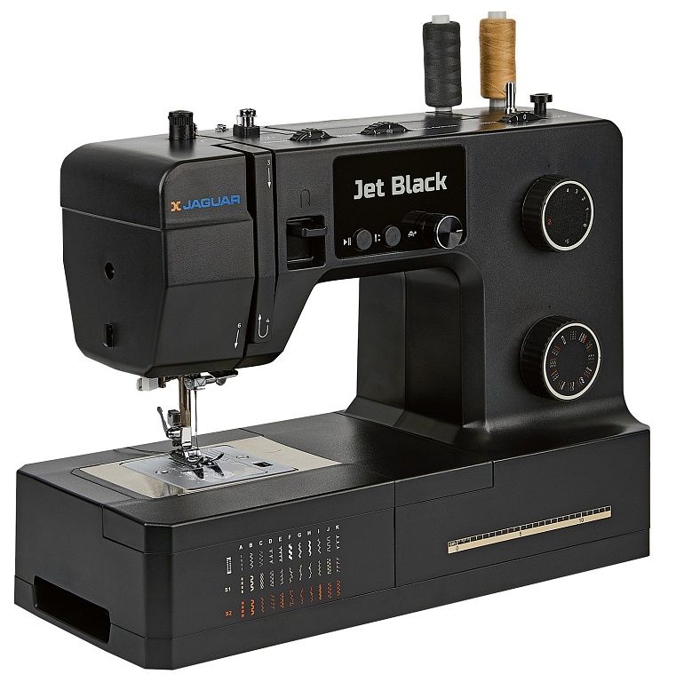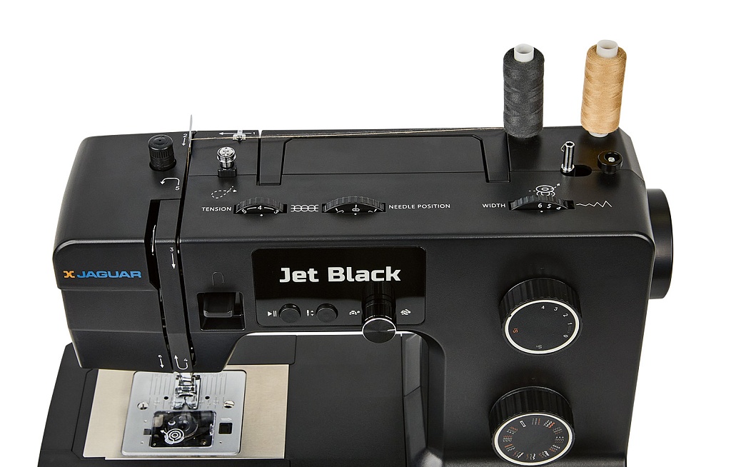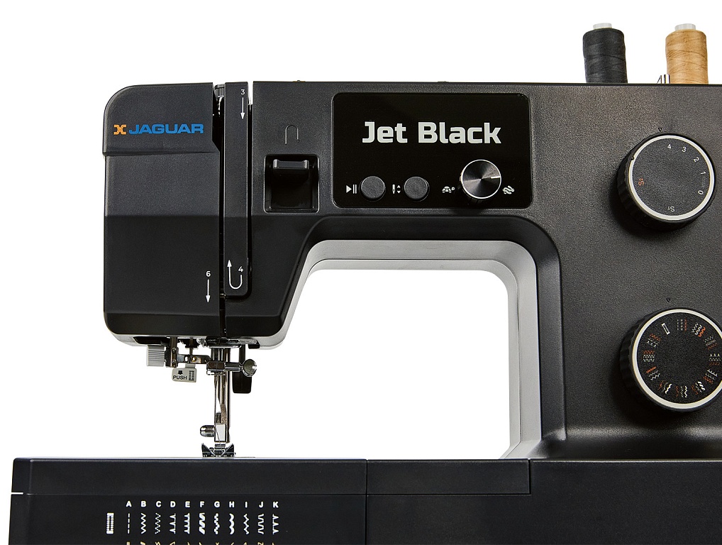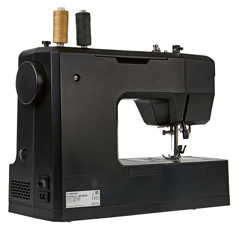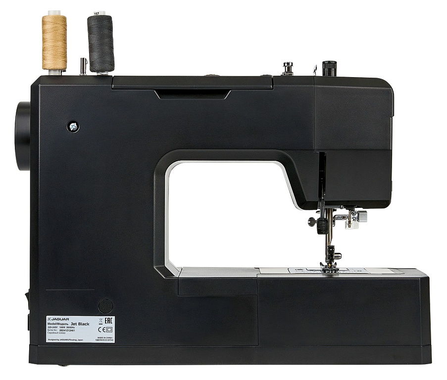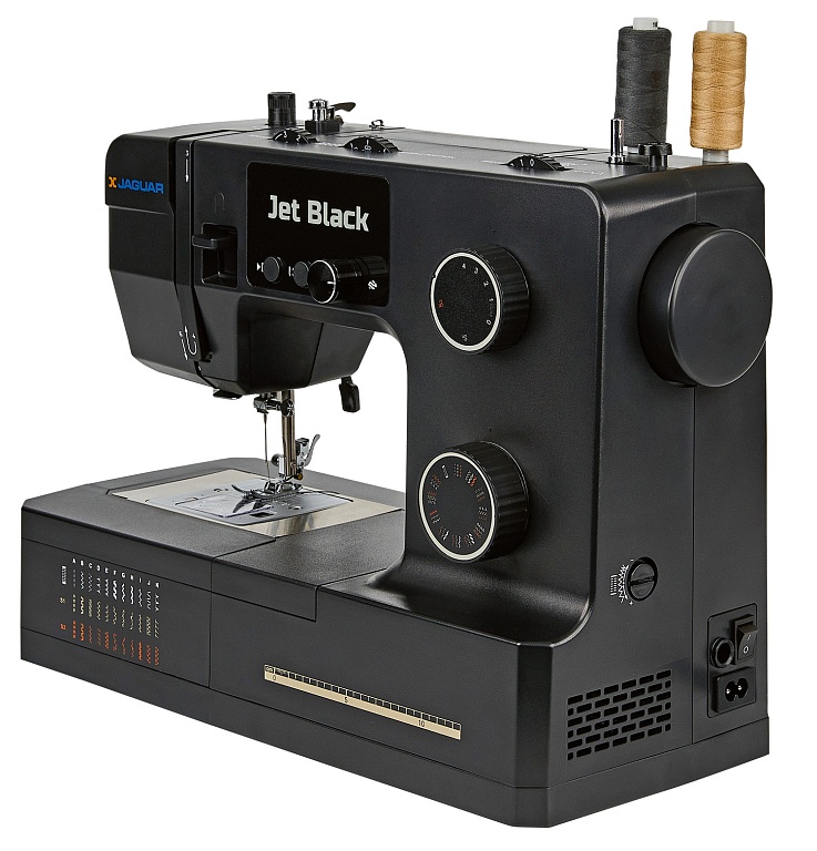 100 Вт, мощная и надёжная, красивая и удобная JAGUAR Jet Black с регулятором давления лапки на ткань может работать с разными типами тяжёлых и плотных материалов, справится с любым домашним ремонтом, быстро сошьёт тяжёлые шторы, постельное бельё, халат и даже джинсы.