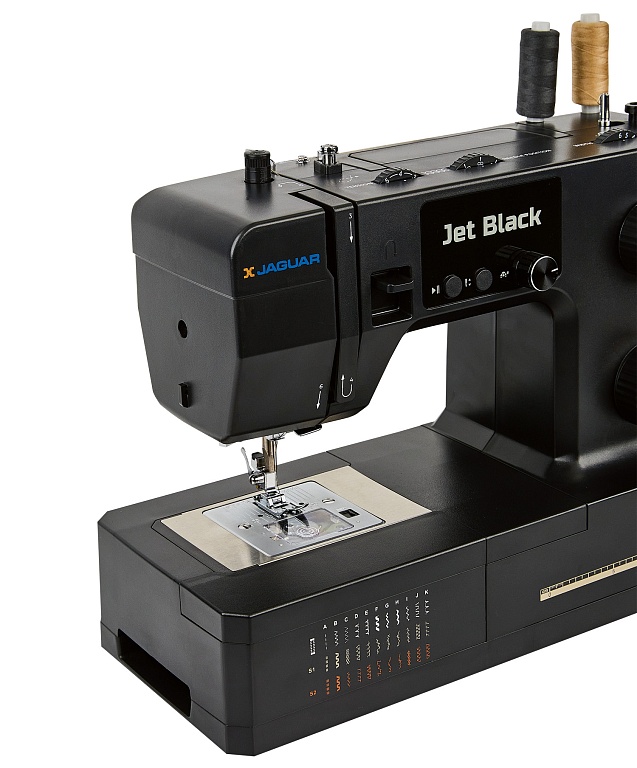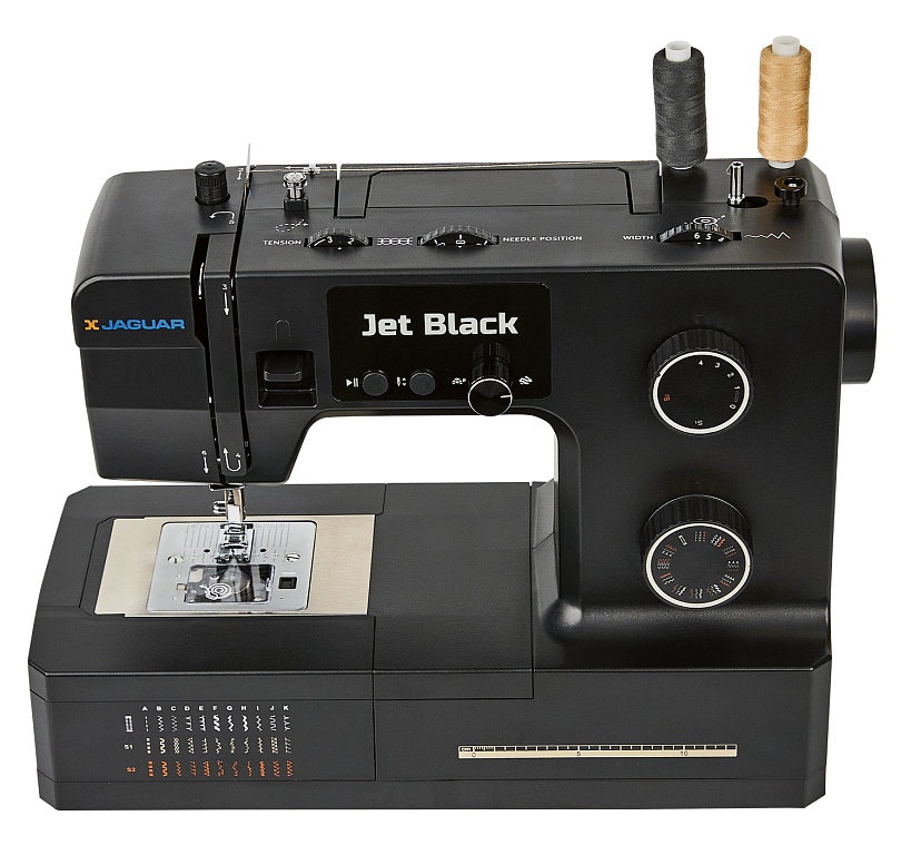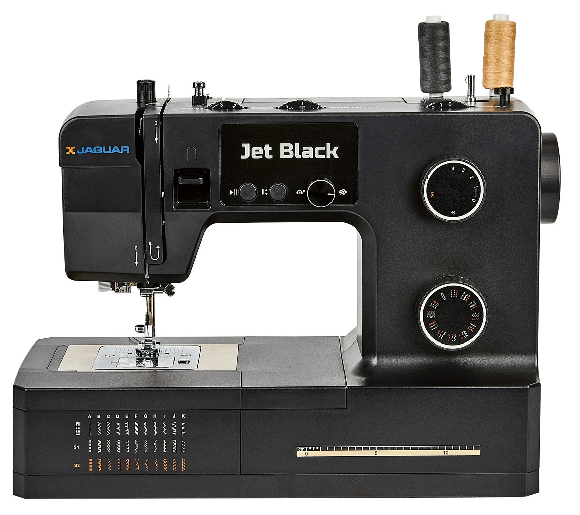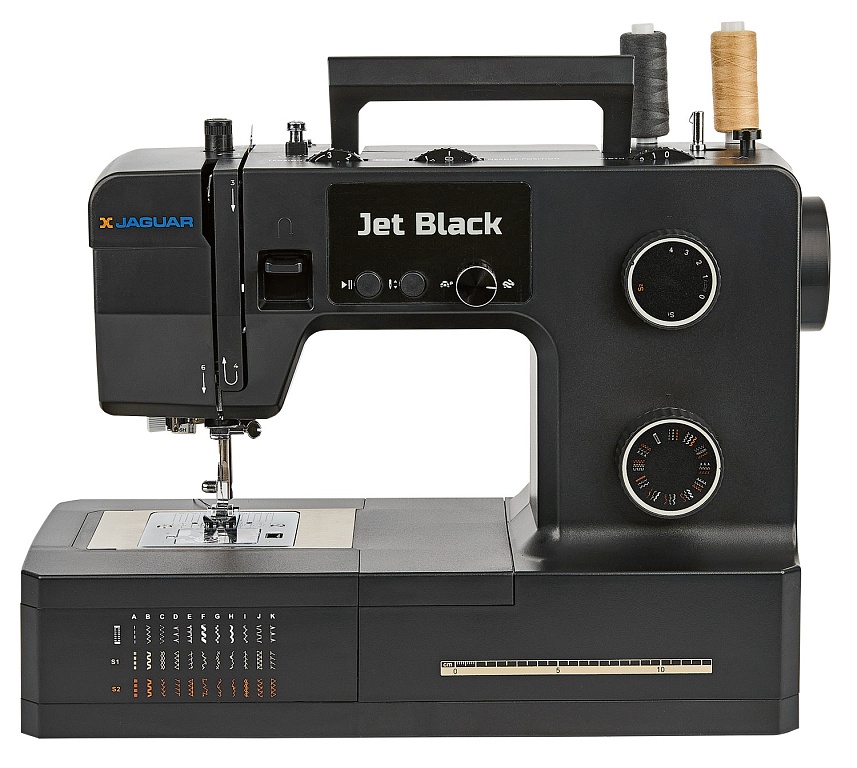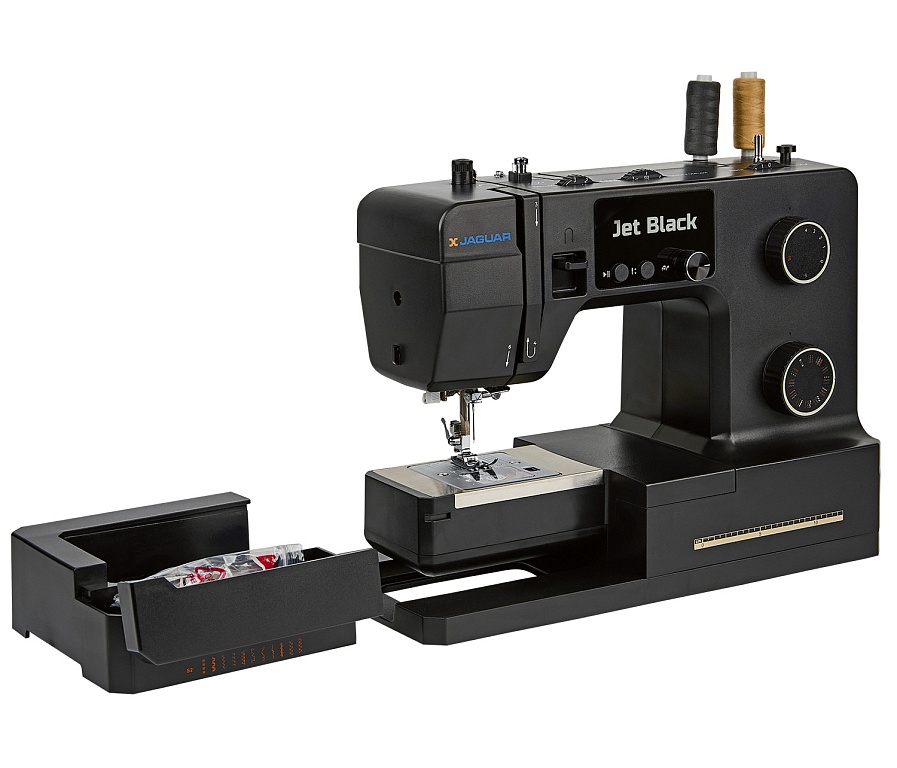 100 Вт, мощная и надёжная, красивая и удобная JAGUAR Jet Black с регулятором давления лапки на ткань может работать с разными типами тяжёлых и плотных материалов, справится с любым домашним ремонтом, быстро сошьёт тяжёлые шторы, постельное бельё, халат и даже джинсы.