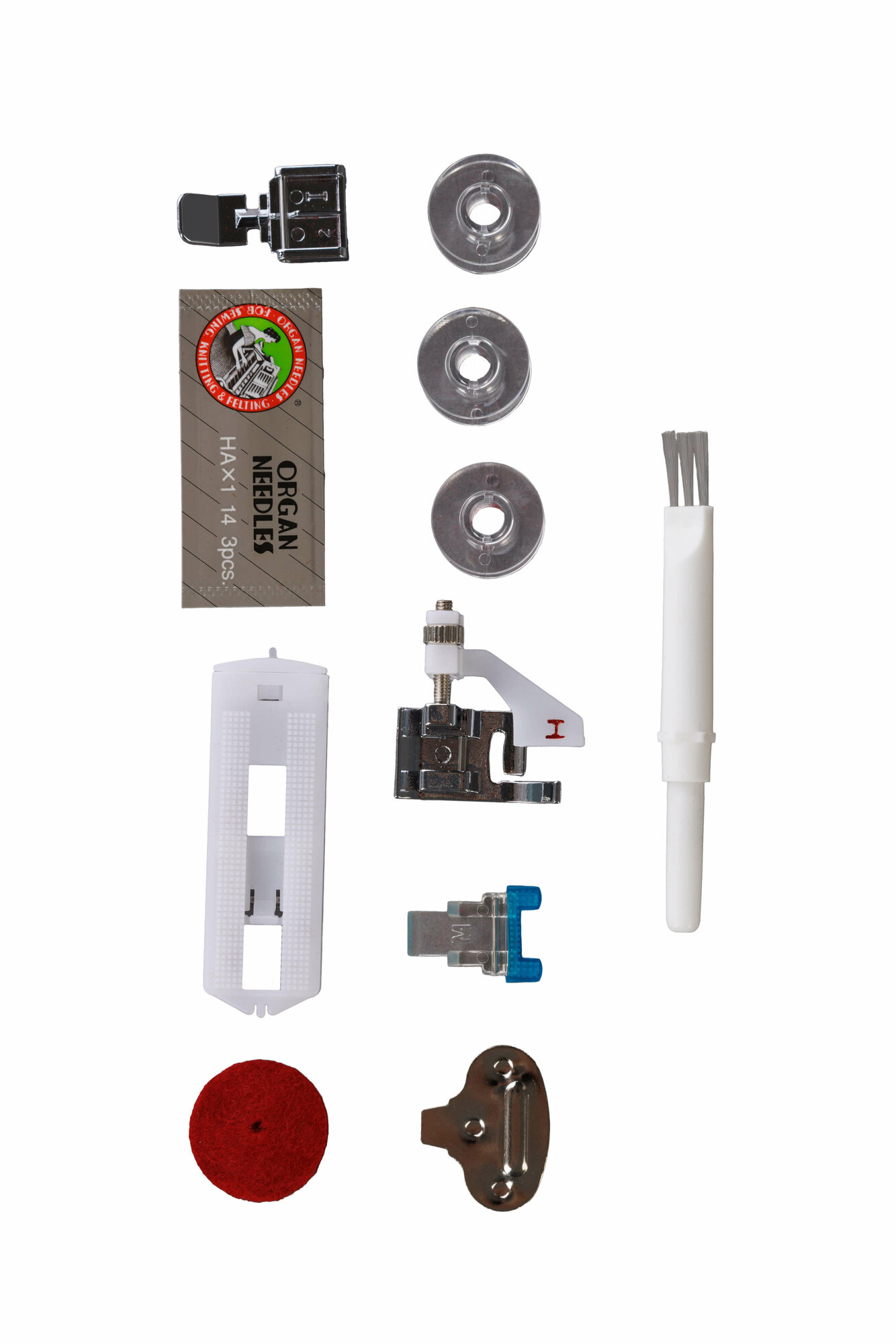 Универсальная лапка, Лапка для вшивания молнии, Рамка для полуавтоматического выметывания петли в 4 приема, Набор игл (3 шт.), Отвертка-ключ, Педаль ножная, Вспарыватель для петли/щеточка для чистки, Фетровая прокладка, Набор шпулек (4 шт.), Мягкий чехол, Инструкция по эксплуатации