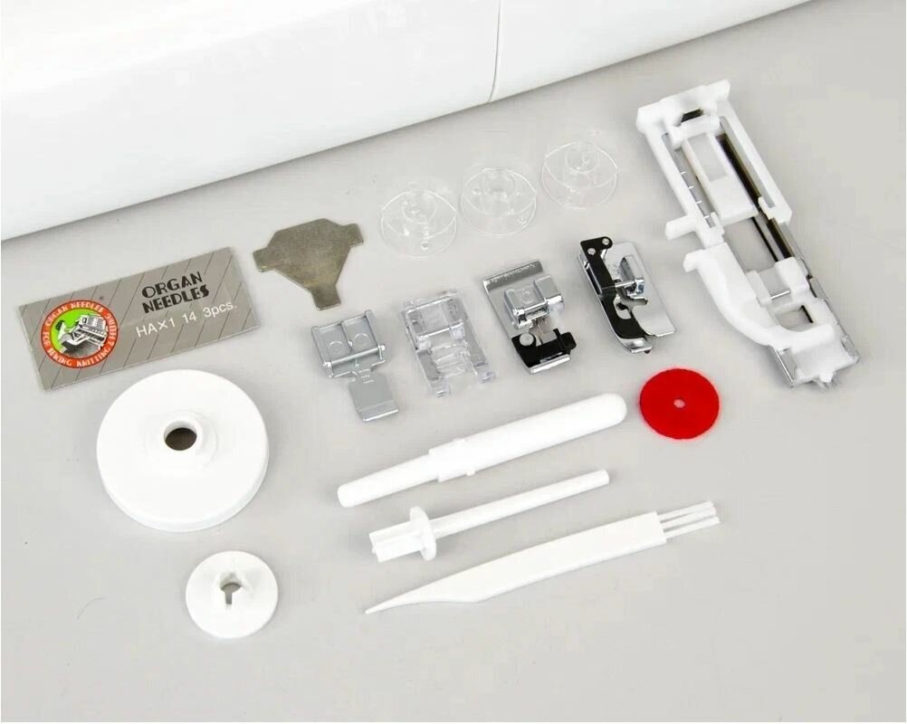 швейная машина, педаль, шнур питания, лапка для петли - автомат (R), лапка для потайного шва (G), лапка для атласных строчек (F), лапка оверлочная (C), лапка для молнии (E), лапка для зигзага (A), дополнительный катушечный стержень, держатель катушки большой и малый, щеточка от пыли, подставка под катушку, фетровая прокладка, набор игл 3шт., шпульки 3шт., вспарыватель, отвертка, инструкция
