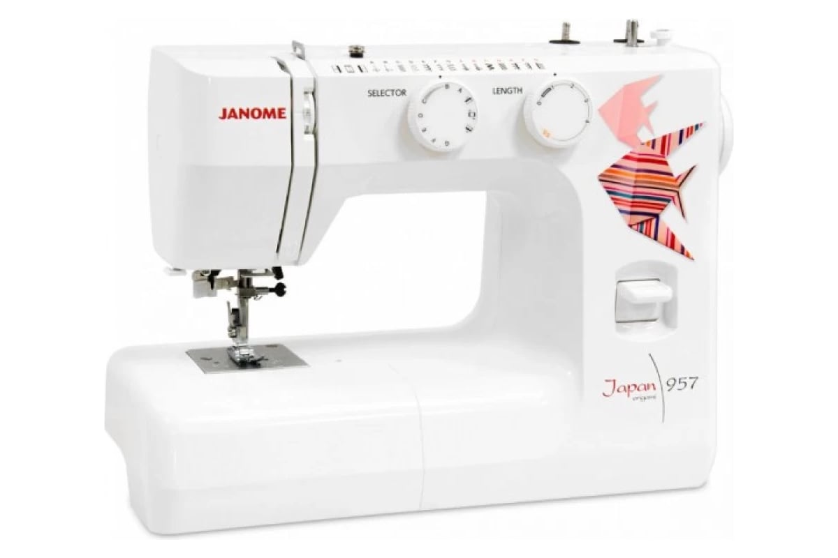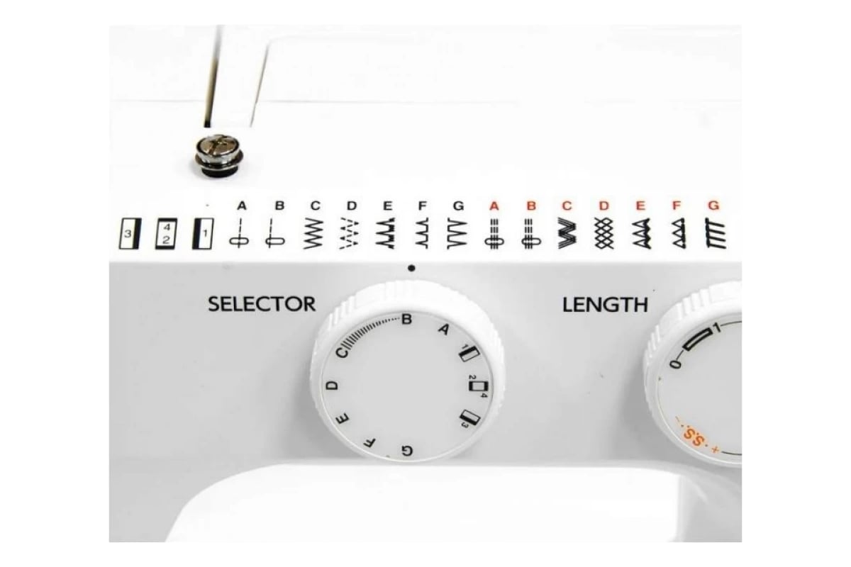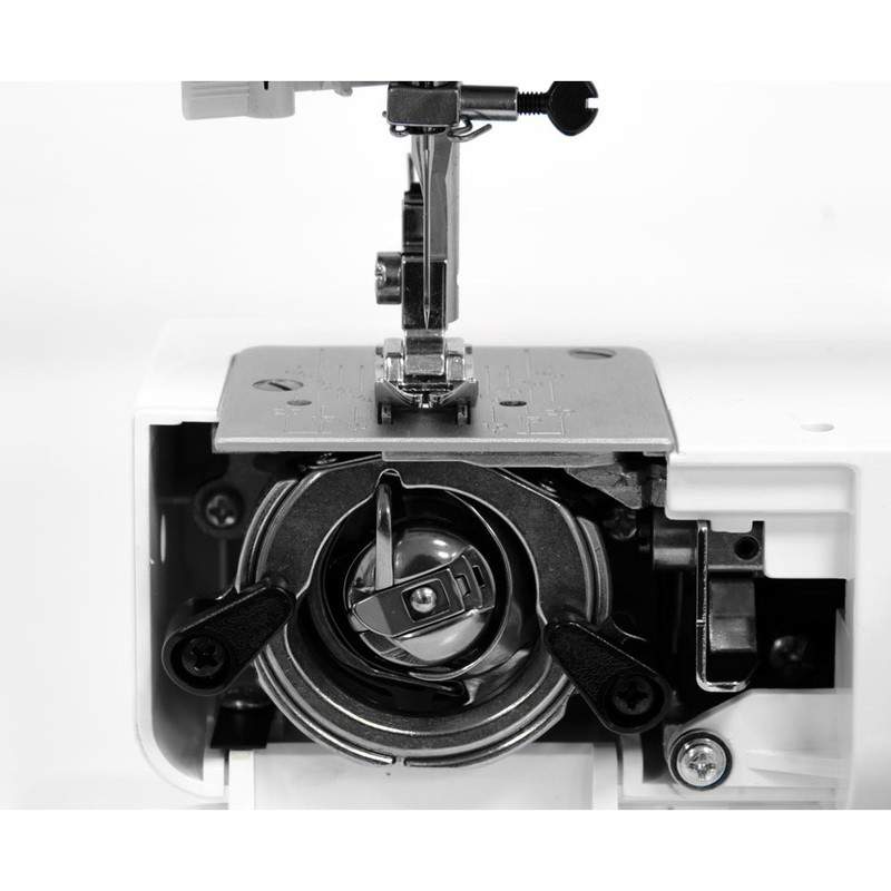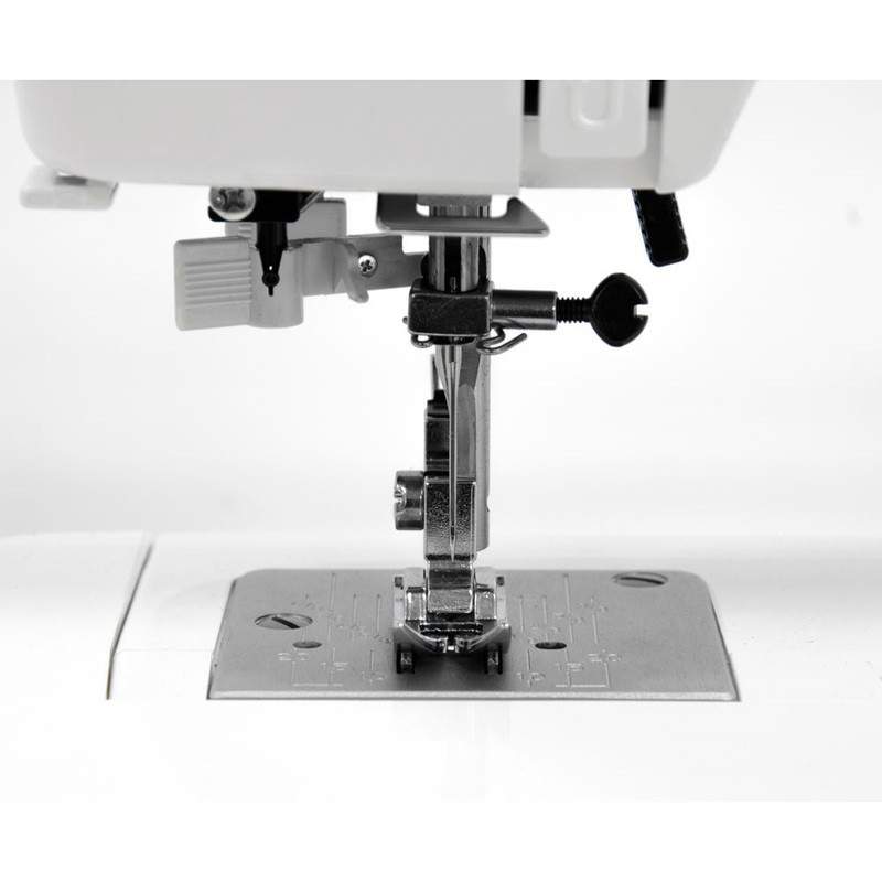 Четырнадцать строчек: рабочие, эластичные и оверлочные, а также полуавтоматический режим для получения аккуратной прорезной петли. Машина хорошо шьёт на разных типах тканей, благодаря мощному мотору. Многие покупатели отмечают в отзывах удобный нитевдеватель и возможность установки двойной иглы. Узкая рукавная платформа поможет легко прострочить или заштопать круговые элементы. Переключатель направления строчки расположен на лицевой части корпуса машины, как и регулятор натяжения верхней нити.