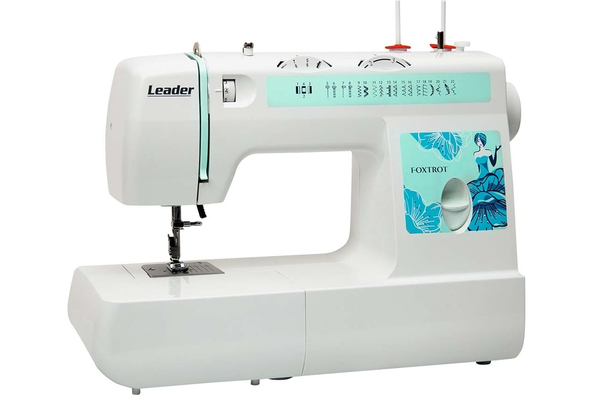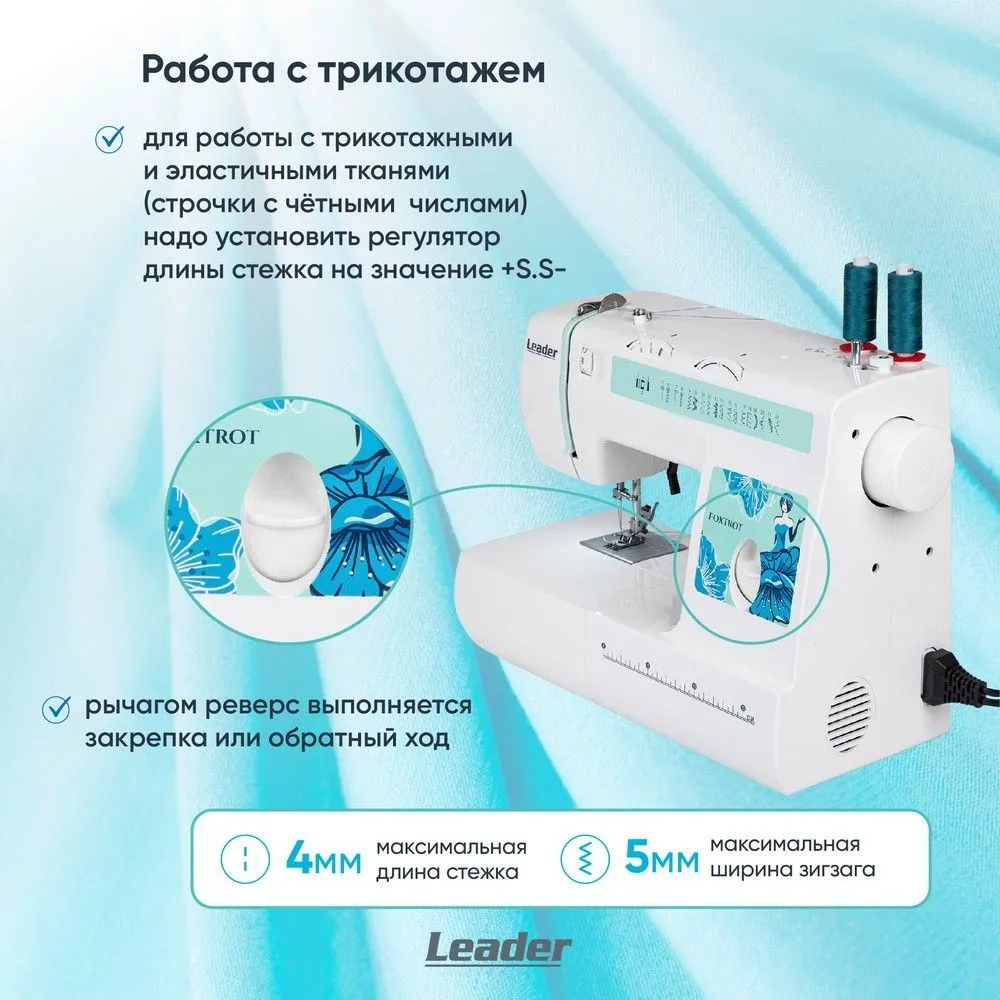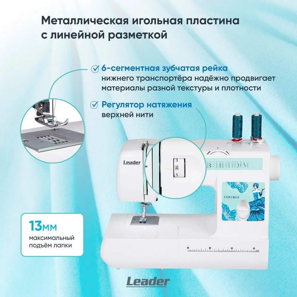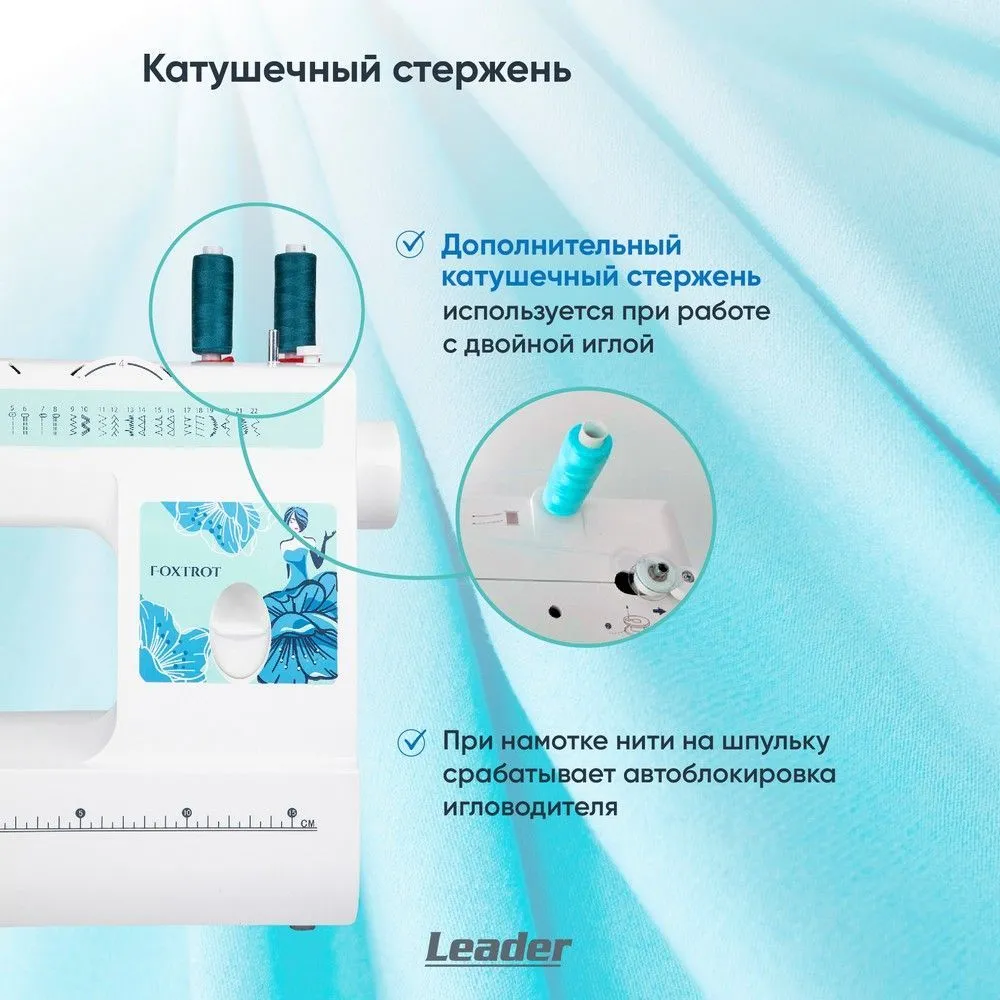 Можно шить шёлк, драп, трикотаж, джинсу сложенную в несколько сложений. Максимальный подъём лапки - 13 мм. Используя второй катушечный стержень можно двойной иглой. Двойная игла приобретается дополнительно. В швейной машине Leader FOXTROT при намотке нити на шпульку срабатывает автоблокировка игловодителя.