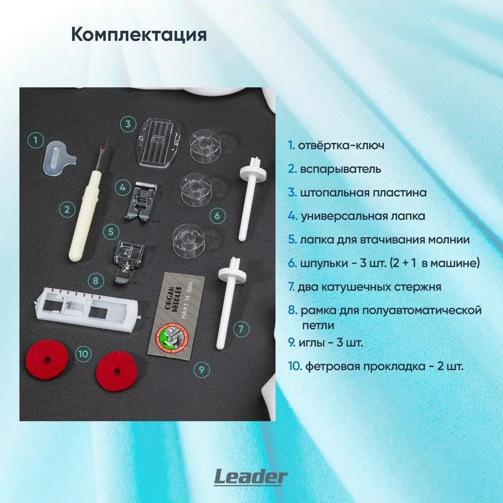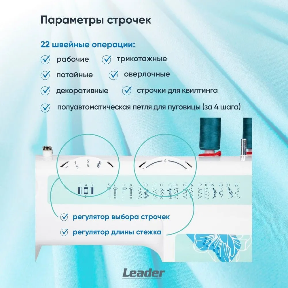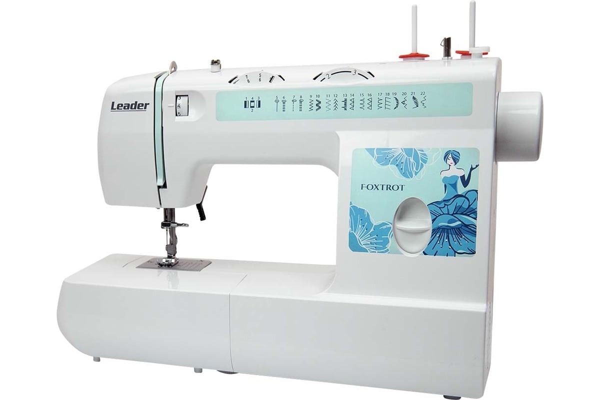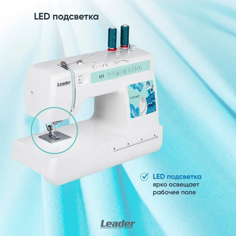 Можно шить шёлк, драп, трикотаж, джинсу сложенную в несколько сложений. Максимальный подъём лапки - 13 мм. Используя второй катушечный стержень можно двойной иглой. Двойная игла приобретается дополнительно. В швейной машине Leader FOXTROT при намотке нити на шпульку срабатывает автоблокировка игловодителя.