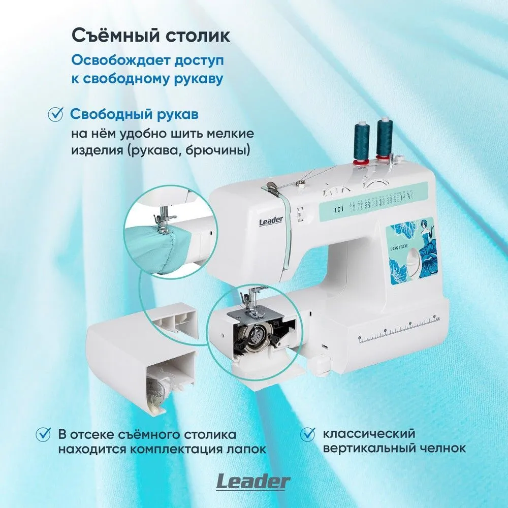 Выполнить штопку или закрепку можно клавишей реверс. Для работы с мелкими изделиями, подшить манжеты рукавов детской одежды или при создании декоративных кукол можно использовать свободный рукав. Необходимо снять съёмный столик, в нём находится комплектация лапок и аксессуаров. Штопальная пластина нужна для того, чтобы закрыть зубчатую рейку и двигать ткань руками во время вышивки в свободно ходовой стёжке. Leader FOXTROT легка в управлении, порадует любителей шитья и тех, кто только собирается научиться шить.