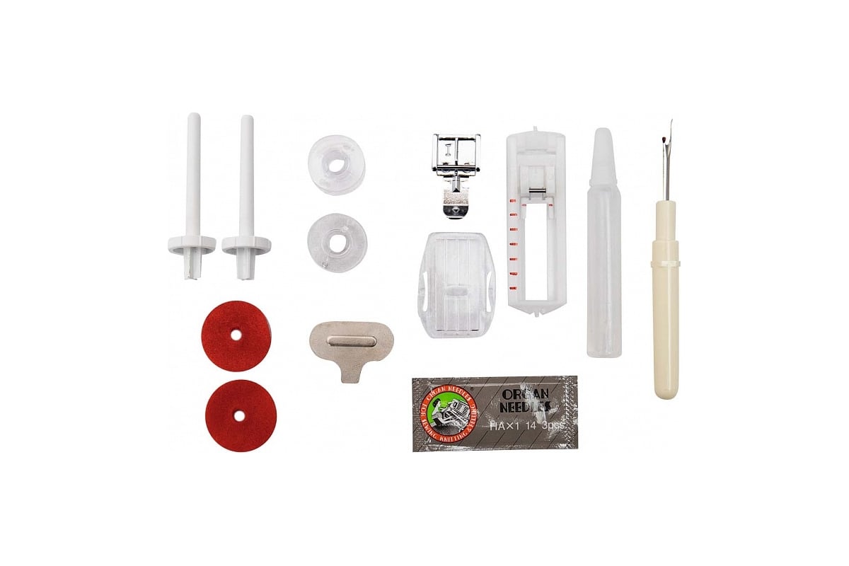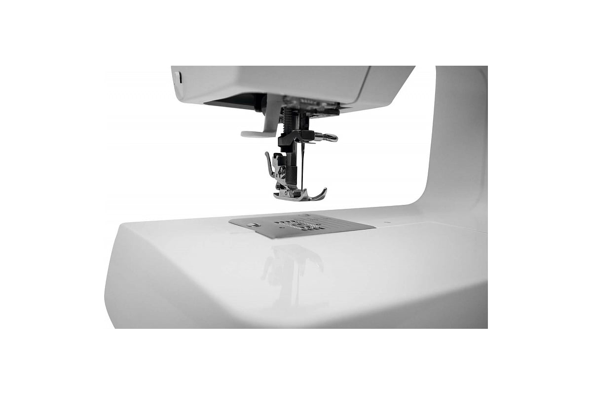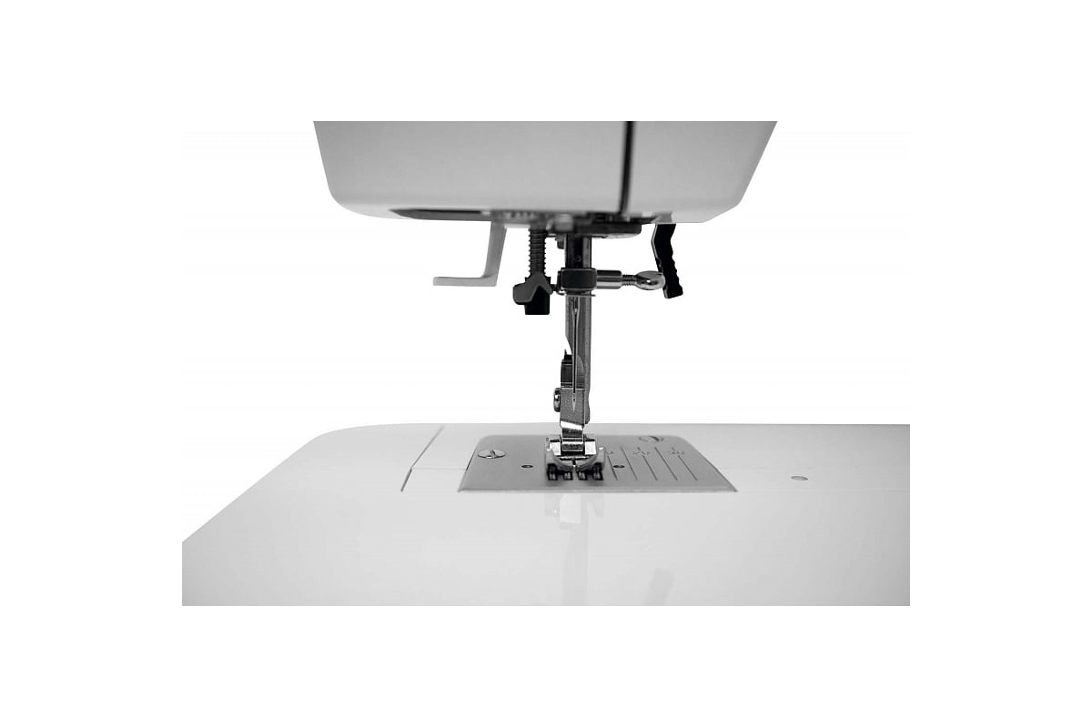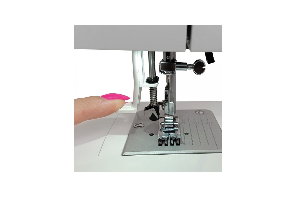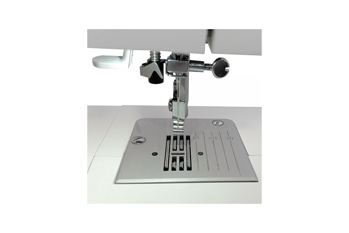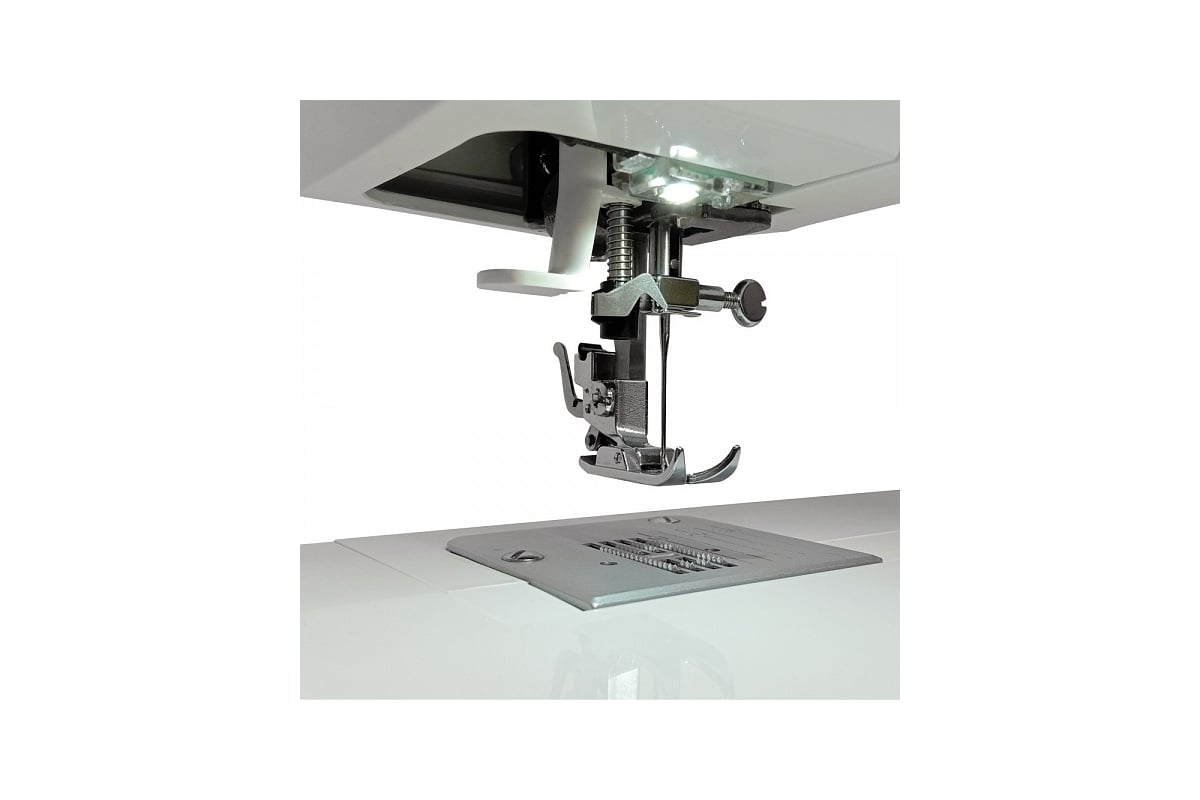 Максимальный подъём лапки в машине - 13 мм, прошьёт изделия из плотных тканей, легко подшивает джинсу. Мелкие изделия или детскую одежду шейте на свободном рукаве. В съёмном столике находится комплектация лапок. Лапка для втачивания молнии и рамка для полуавтоматической петли. Для штопки и вышивки в свободно ходовой технике используйте штопальную пластину, она тоже входит в комплектацию.