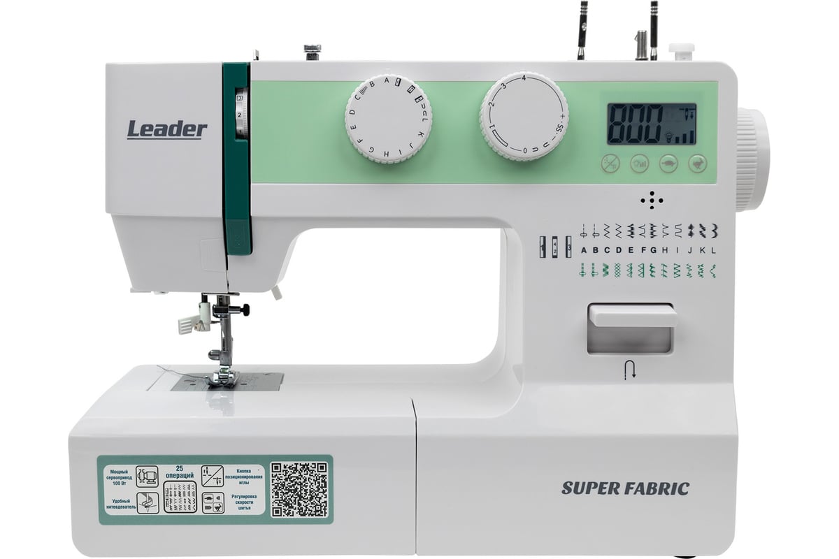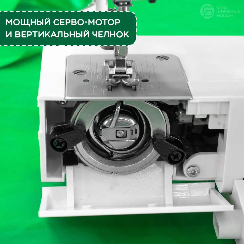 Бытовая электронная швейная машина с сервоприводом, потребляемой мощностью 100 Вт и максимальной скоростью шитья до 800 ст./мин. Машина с вертикальным челноком предлагает выбор из 25 видов швейных операций, в том числе полуавтоматическую петлю для пуговицы. Выбор строчки и настройка длины стежка устанавливаются регуляторами.