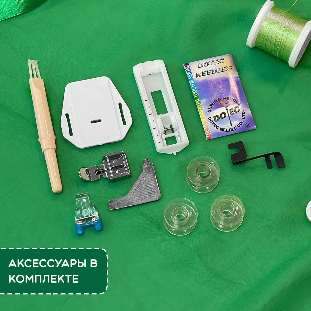 Достаточно широкий выбор трикотажных, потайных, оверлочных и декоративных строчек. На данной машине можно шить любые типы тканей и подшивать джинсу. При намотке нити на шпульку срабатывает автоблокировка игловодителя, нить быстро и равномерно наматывается на шпульку. Встроенный нитевдеватель ускорит процесс шитья, заправит нить в ушко иглы.