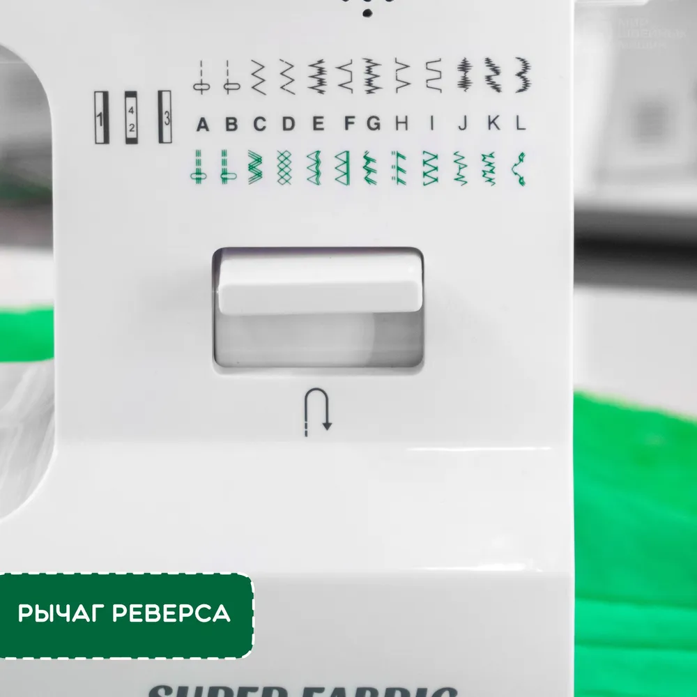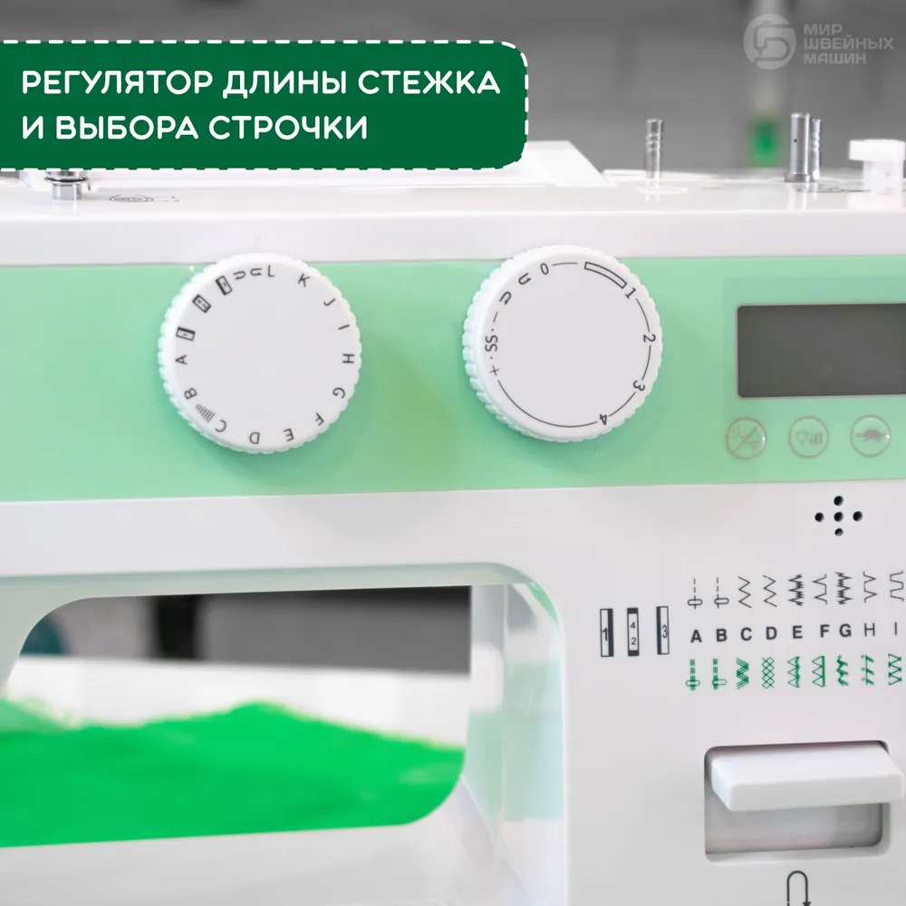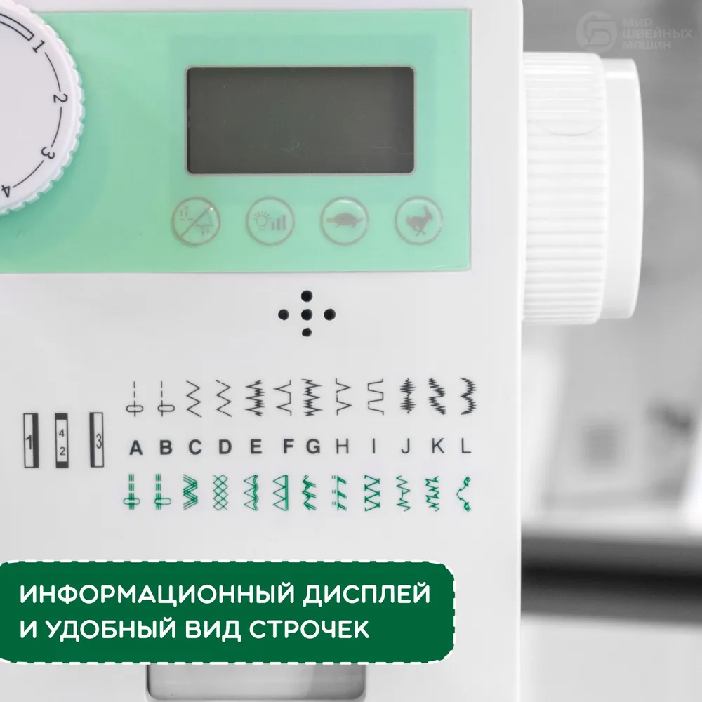 Уникальность машины - в изменении функции скорости шитья и позиционирования иглы (положение иглы вверх/вниз). С помощью кнопок меняются настройки машины. На ЖК дисплее отображаются символы положения иглы, яркость освещения рабочей зоны шитья и значение скорости шитья. Максимальная длина стежка - до 4 мм, а ширина зигзага - до 5 мм.
