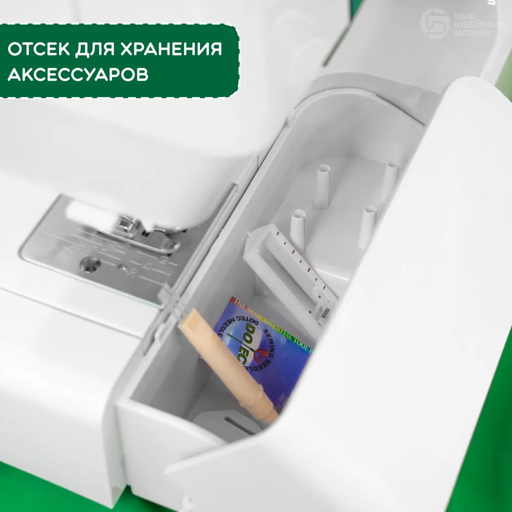 В съёмном столике в отсеке для аксессуаров расположены специальные стержни для шпулек, которые удобно использовать во время работы, есть лапка для пришивания пуговиц.
