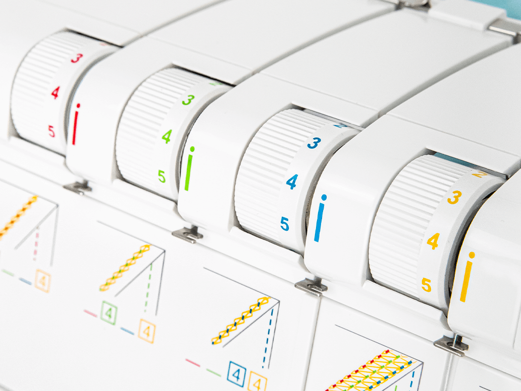 Заправка нитями отмечена цветными метками,исключающими ошибки и неточности. Каждой нити присвоен свой цвет. Справочная информация содержится в цветной диаграмме на внутренней поверхности передней откидывающейся крышки.