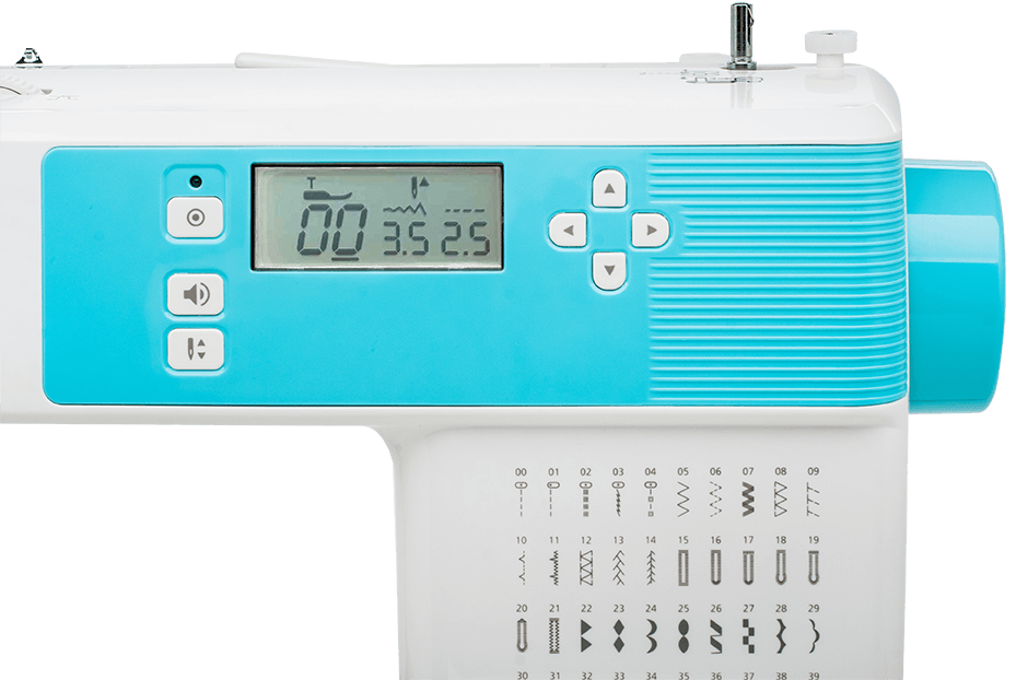 На дисплее управления отображаются все режимы работы машины: тип строчки, ширина и длина стежка, тип используемой лапки, положение иглы, реверс/закрепка шва, необходимость использования рычага обметывания петель, режим намотки шпульки.