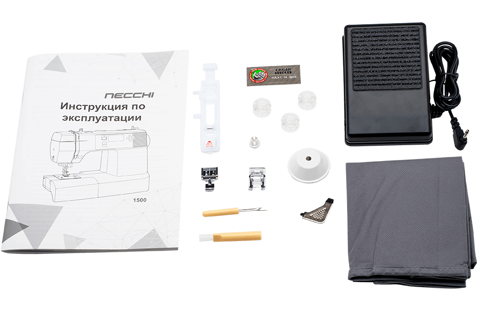 На машине установлена универсальная прижимная лапка. Так же в комплекте поставки машины есть лапка для пуговичных петель, лапка для вшивания молний и канта, лапка для атласных строчек