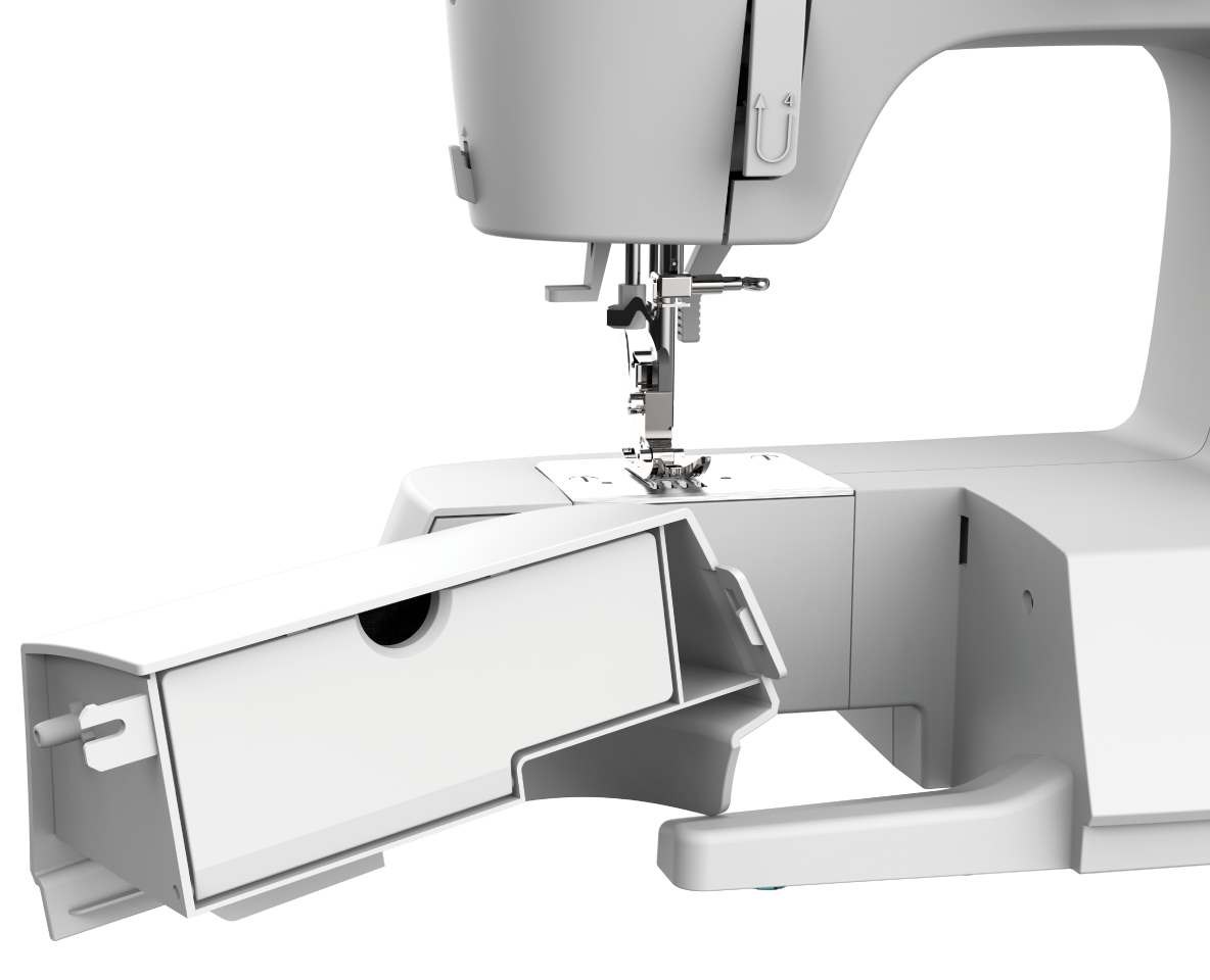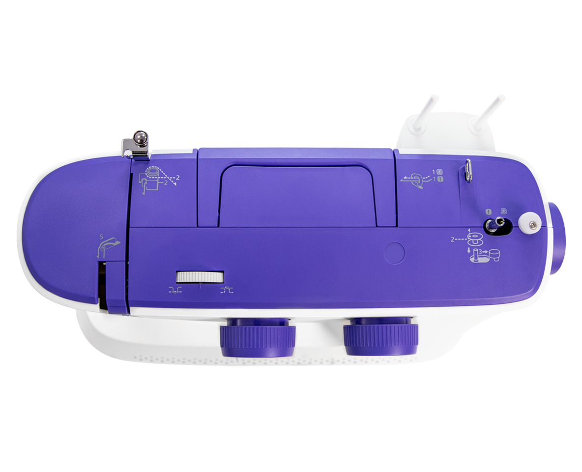 Два вертикальных катушечных стрежня, расположенных вертикально на одной планке, как на профессиональной технике. Позволяет легко менять катушки для намотки шпульки, и использовать двойную иглу.