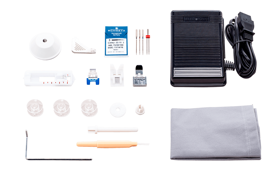 Комплект аксессуаров находится внутри съемного столика. В комплект входит: стандартная лапка (1), большой и маленький держатели катушки (10,11), вспарыватель шва со щеткой для чистки машины (6), лапка для выметывания петли (5), дополнительный стержень для шитья двойной иглой (14), лапка для пришивания молнии (2), лапка для пришивания пуговицы (3), отвертка (13), шпульки (9), направляющая для квилтинга (8), запасные иглы (15), двойная игла (7), фетровая подушечка для катушки (12), тефлоновая лапка (4).