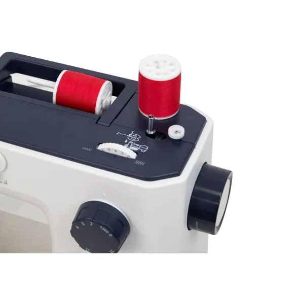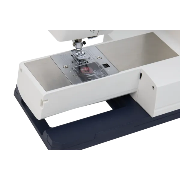 Дополнительный столик образует большую рабочую поверхность для удобной работы с объемными и готовыми изделиями. Ткань ровным полотном подается под лапку, строчка получается идеальной как на промышленных машинах!