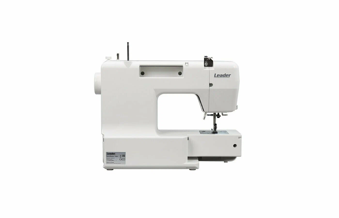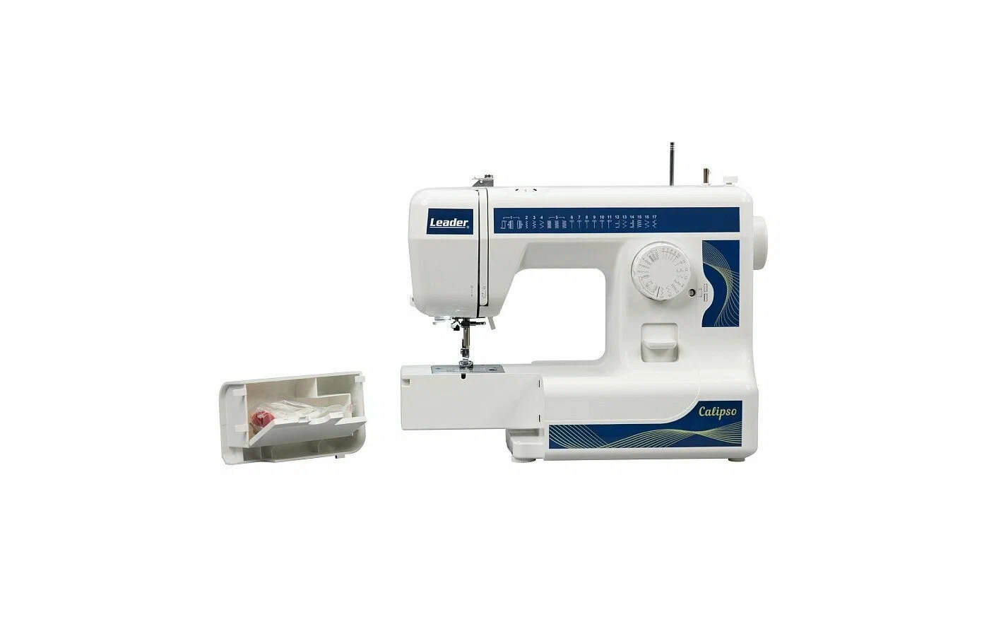 швейная машина - 1 шт, вспарыватель для петель - 1 шт, дополнительный стержень для катушки - 1 шт, набор игл - 1 шт, пластина для штопки - 1 шт, чехол - 1 шт, набор фетровых прокладок для катушек - 1 шт, набор шпулек - 1 шт, щеточка для очистки - 1 шт