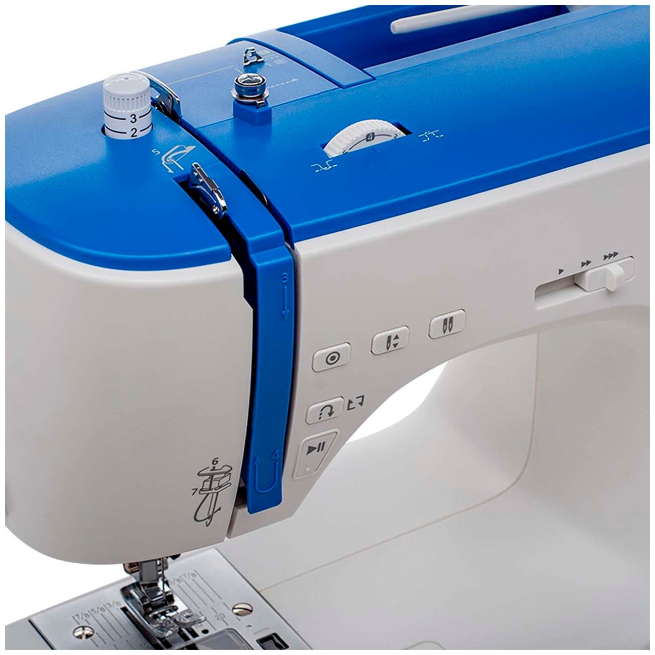 Дополнительные функции кнопка реверса, переключатель положения иглы (верх/низ), регулировка давления лапки на ткань, шитье без педали