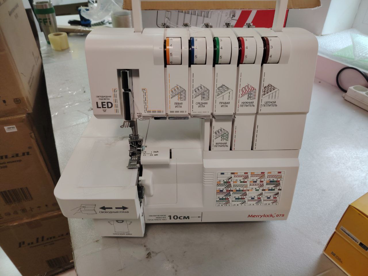 В память Merrylock 075 заложено 14 операций, ответственных за создание всевозможных видов швов. Устройство отлично справляется с обработкой легких и средних по плотности тканей. Благодаря интуитивно понятному интерфейсу, даже начинающая швея сможет без труда разобраться в принципах работы данной модели, а также выбрать и настроить необходимую опцию. Съемная рукавная платформа значительно облегчает обработку узких элементов изделий, а яркая встроенная подсветка снижает нагрузку на глаза и уменьшает расход электроэнергии. Дополнительный комфорт при работе обеспечивают регулятор давления лапки, линейка, расположенная на корпусе, заправщик нити и петлителя.