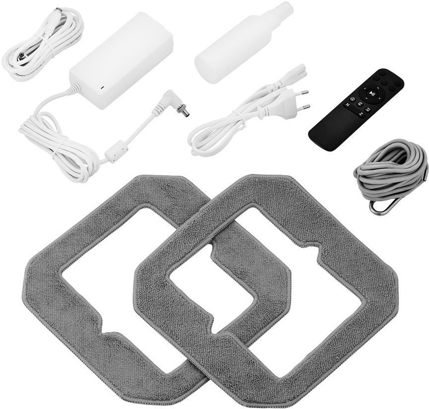 Помимо пульта дистанционного управления, в комплекте с роботом идут сетевой шнур с блоком питания и удлинителем, страховочный трос с карабином, 2 чистящих салфетки, флакон для чистящего средства. Резервный аккумулятор 700 700 мА*ч - удерживает робот на окне около 15 мин.