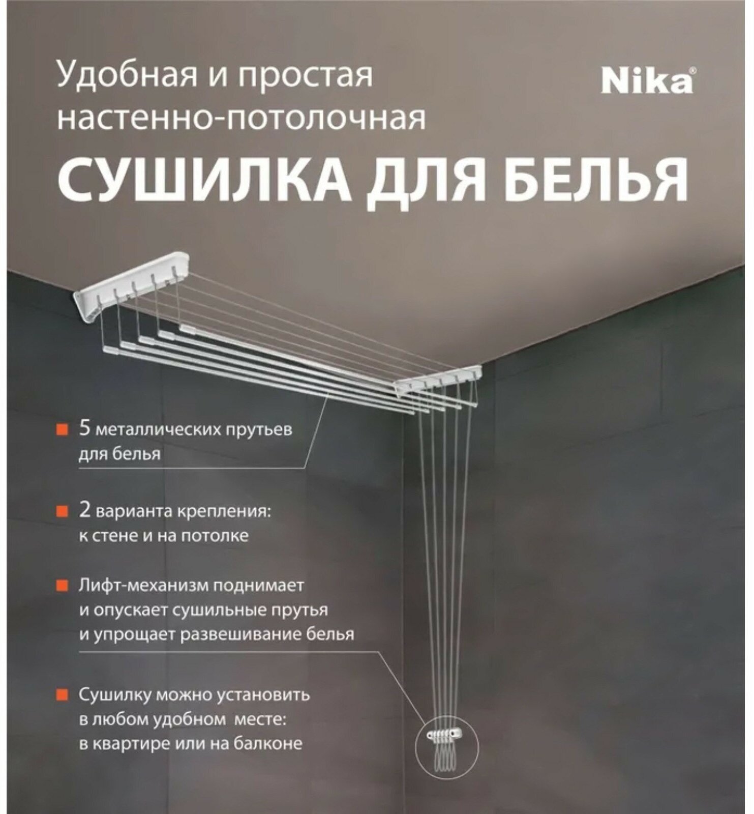 Настенно-потолочная сушилка Nika 9м СНП 1.8 белая НИКА-СНП1.8/БЕЛАЯ предназначена для сушки белья в помещении.