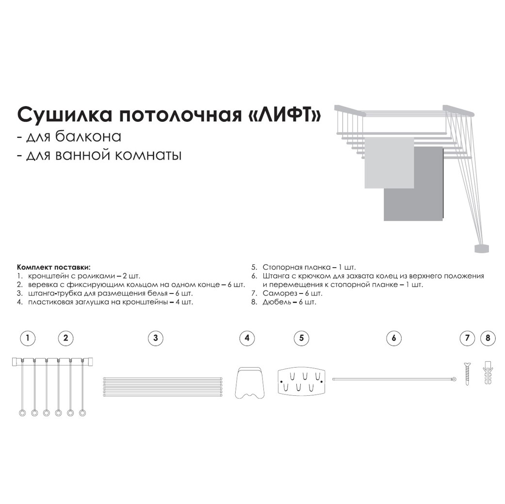 Сушилка для белья с возможностью крепления на стену или к потолку. Оптимальна для использования в ванной комнате или на балконе. Изготовлена из нержавеющей стали с полимерным порошковым покрытием, которое защищает от воздействия влаги и предотвращает механические повреждения. Представляет из себя конструкцию из крепежных кронштейнов, штанг-трубок, на которых развешивается бельё, и веревочной системы для фиксирования штанг на двух разных положениях: на высоте комфортной для развешивания белья и на высоте для сушки белья. Суммарная длина поверхности для размещения белья - 8,4м. Максимальная нагрузка - 12кг.