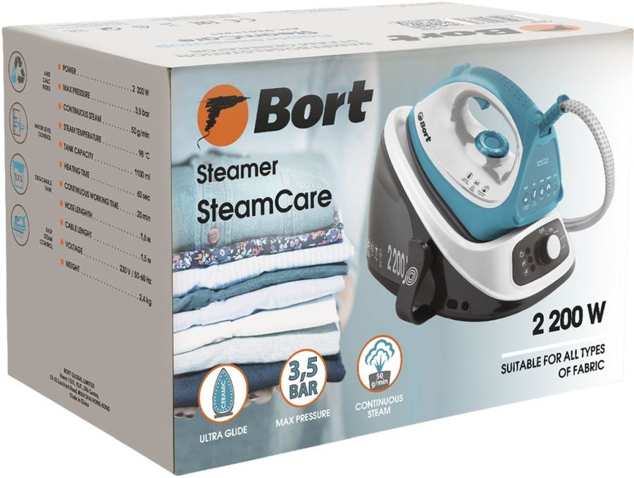 мощность: 2200Вт; давление пара: 3.5Бар; производительность пара: 50г/мин; регулятор пара: отсутствует; длина парового шланга: 1.6м