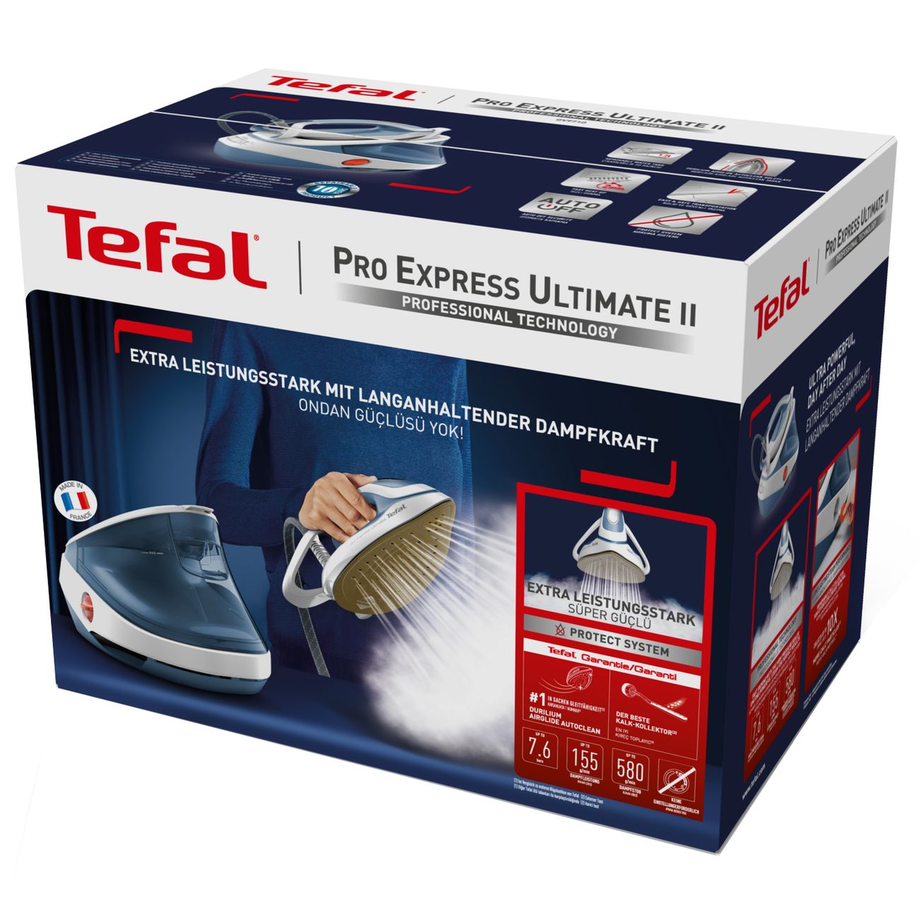 Парогенератор Tefal GV9710E0 работает по технологии No Setting: он создает оптимальное соотношение интенсивности подачи пара и температуры и одинаково бережно и эффективно ухаживает за тканями любых типов. Прибор создает давление 7,6 бар, скорость подачи пара достигает 155 г/мин, паровой удар в 580 г/мин справится со сложными заломами. Потребляемая мощность — 3000 Вт.