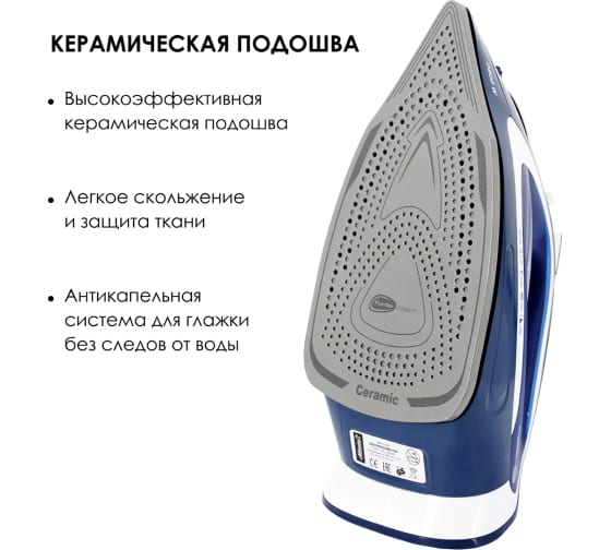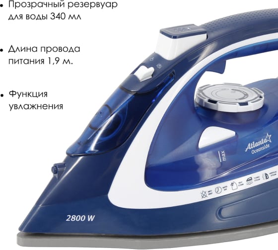 Утюг с пароувлажнением Atlanta ATH-5578 (blue) оснащен высокоэффективной керамической подошвой с уникальной формой, которая позволит еще лучше и качественнее проглаживать вещи, экономя при этом время и силы. Использование инновационной технологии керамического покрытия делает подошву устойчивой к царапинам.