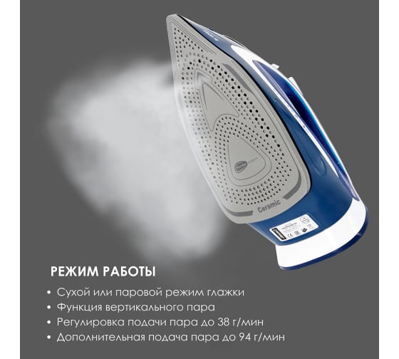 Парогенерирующая система. Высокая стабильность парового патока основана на значительной теплоемкости парогенерирующей мембраны и высокой мощности парового утюга. Порция воды подается на массивную металлическую мембрану, которая создает густой пар без капель и равномерно распределяет его по всем отверстиям высокоэффективной подошвы. Кроме того, утюг с паром оснащен системой "Антикапля", которая полностью блокирует систему до достижения заданной температуры, тем самым, исключая даже небольшие протечки.