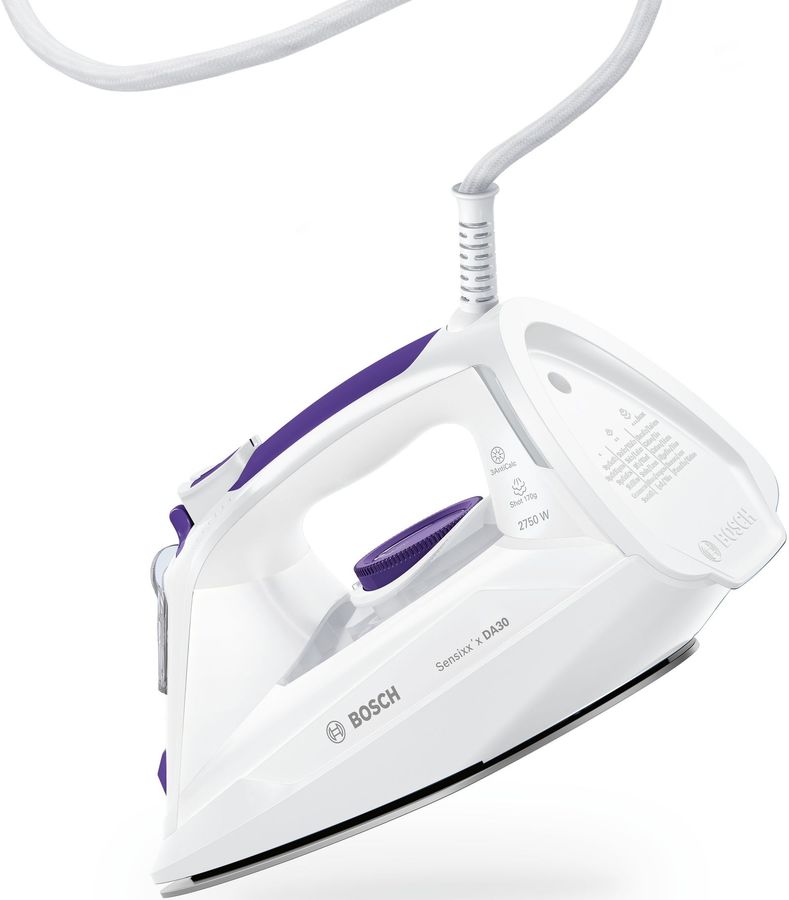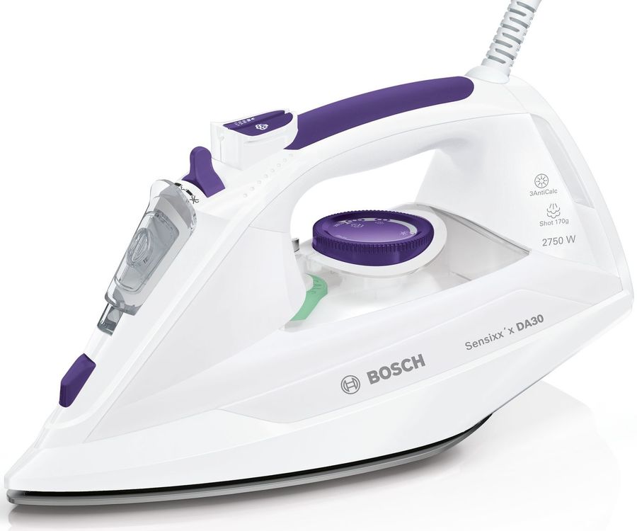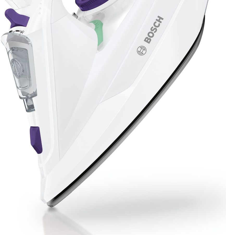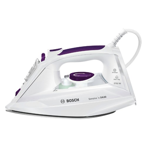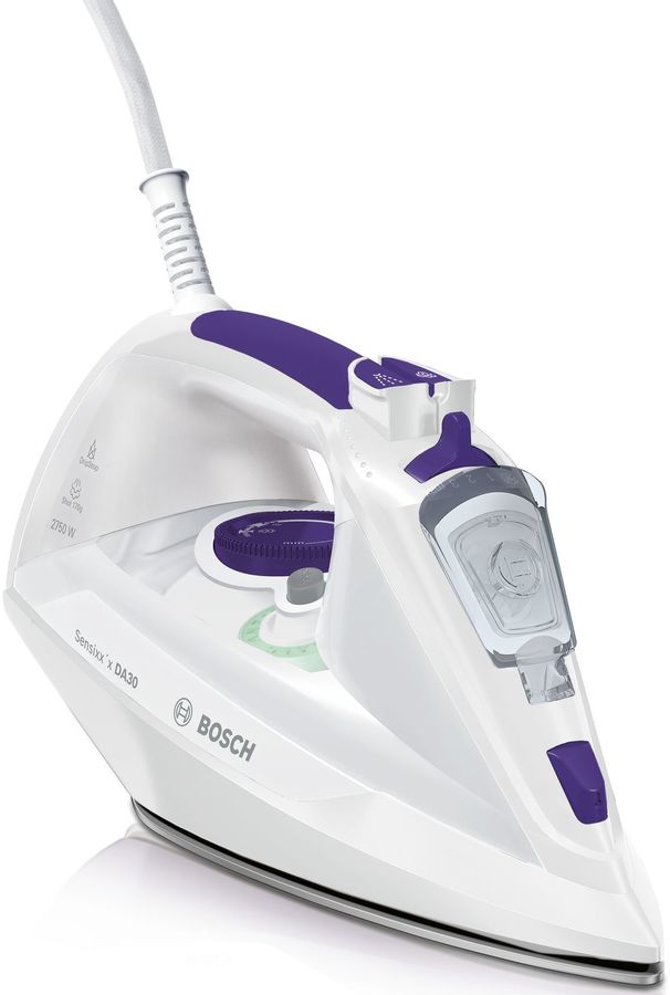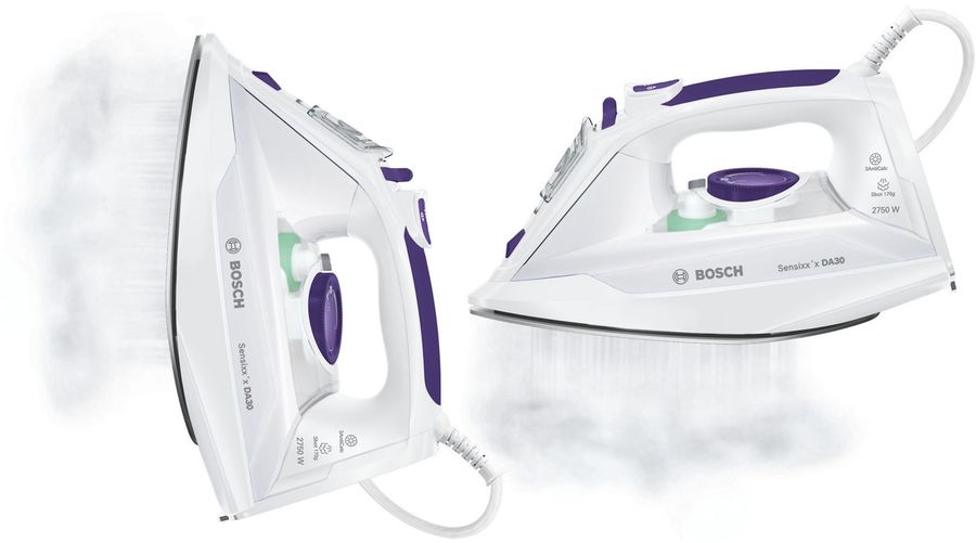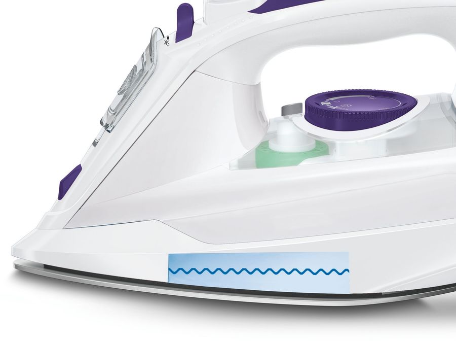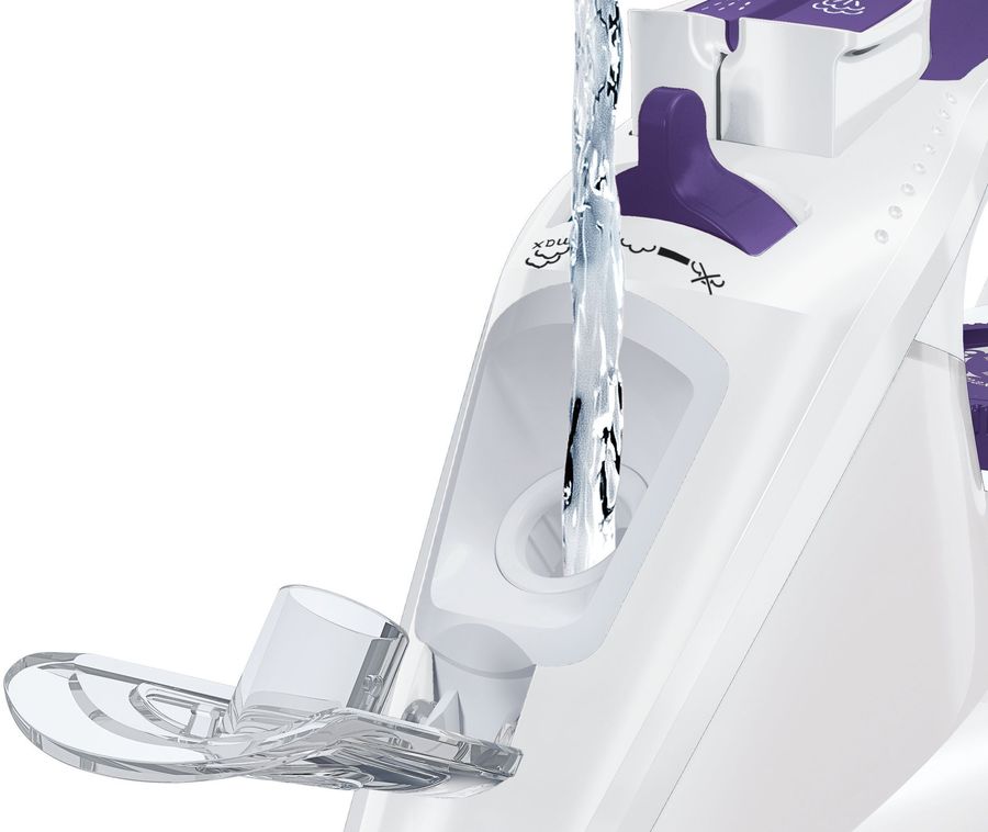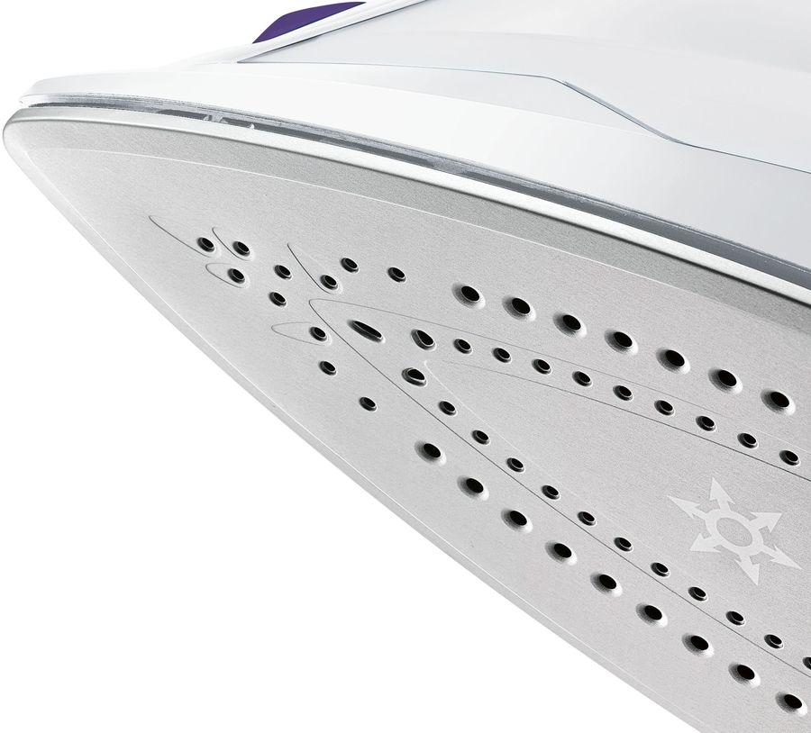 пароувлажнение; мощность: 2850Вт; паровой удар: 170г; емкость для воды: 320мл; подошва: Ceranium glissee; самоочистка от накипи; цвет: белый и фиолетовый