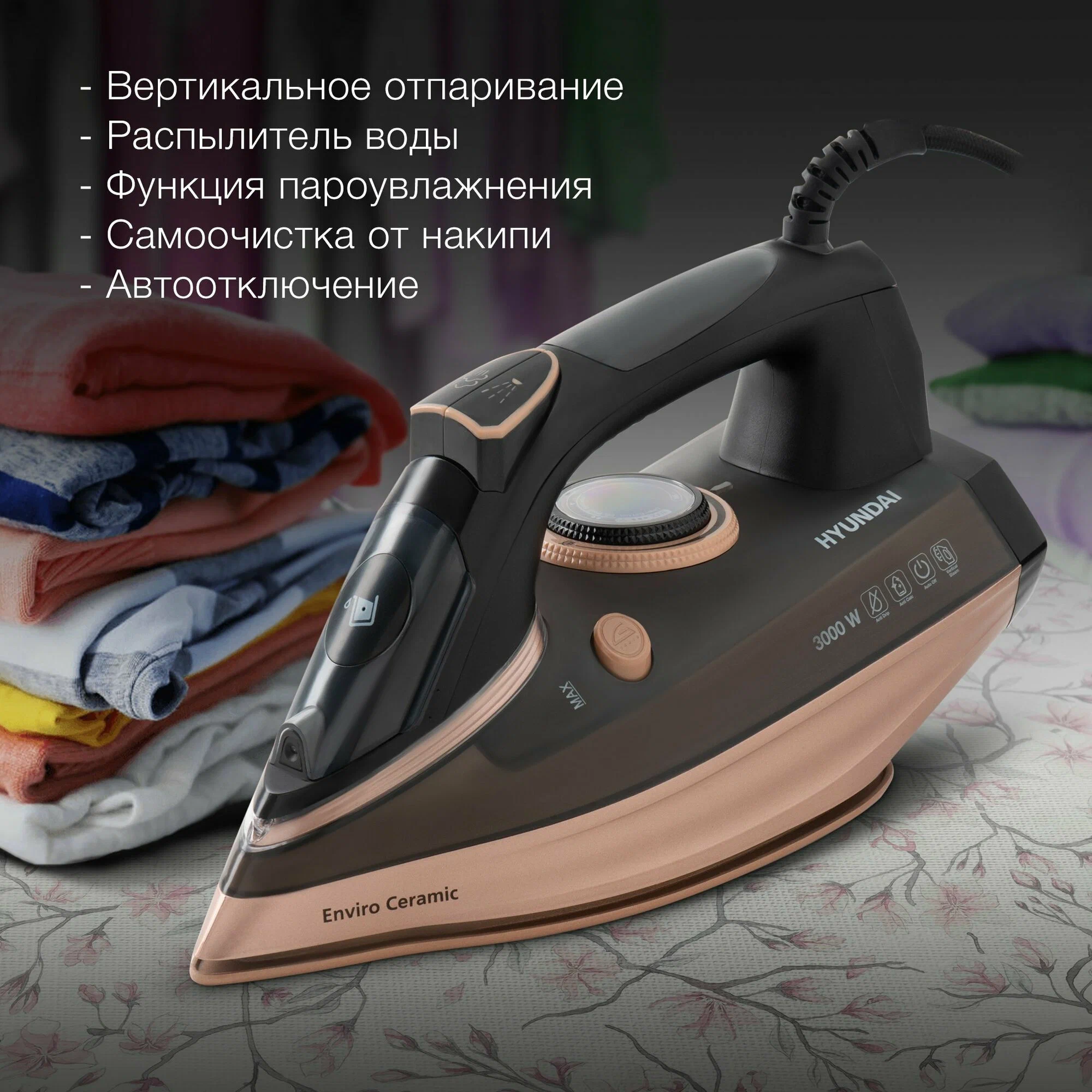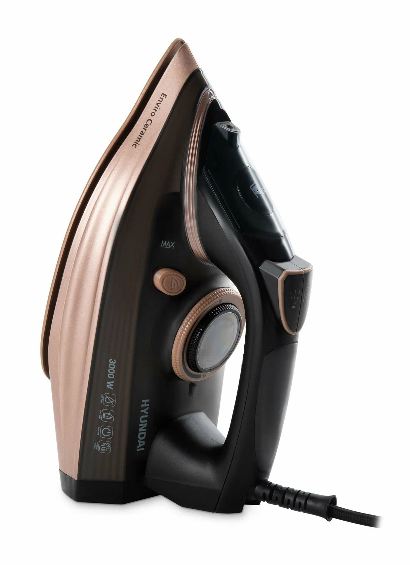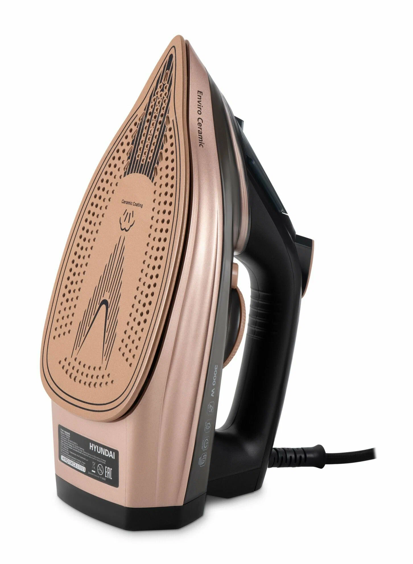 Прибор может работать в четырех температурных режимах, чтобы даже привередливая ткань под его воздействием не портилась. Максимальная мощность данной модели – 3000 Вт, но его подошва изготовлена из качественной керамики Enviro Ceramic, поэтому равномерно нагревается и обеспечивает бережную глажку. Утюг также оснащён удобной функцией – парогенератором с возможностями вертикальной обработки, пароувлажнения и опцией «паровой удар» для особенно сложной одежды. Во время него прибор единовременно испаряет до 220 г жидкости под давлением. Ёмкость резервуара для воды составляет 380 мл, для её удобного и быстрого заполнения в комплекте с Hyundai H-SI01222 поставляется мерный стакан с эргономичным носиком, предотвращающим разлив. Также утюг оснащён и стандартным распылителем, чтобы увлажнять ткань и легче её разглаживать.