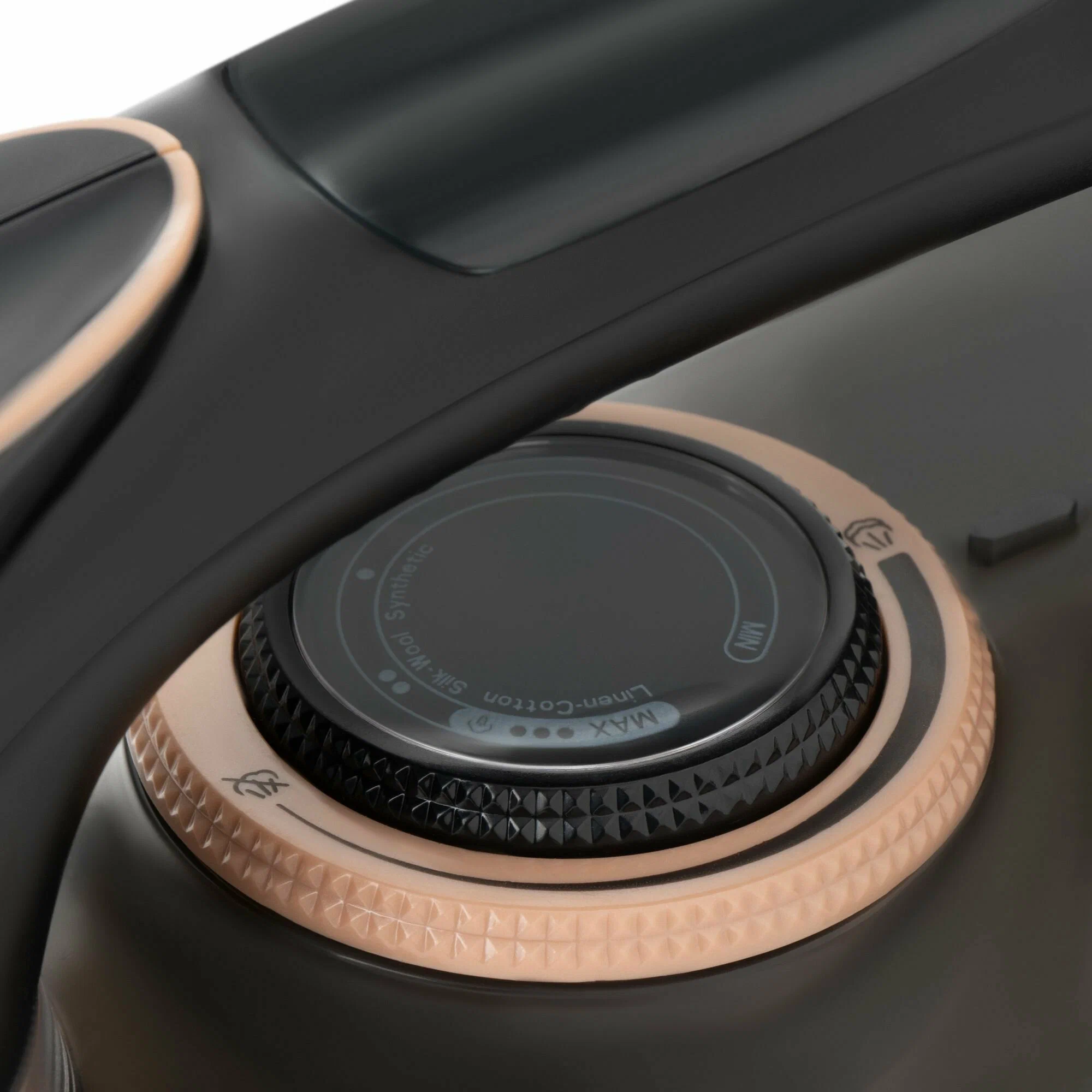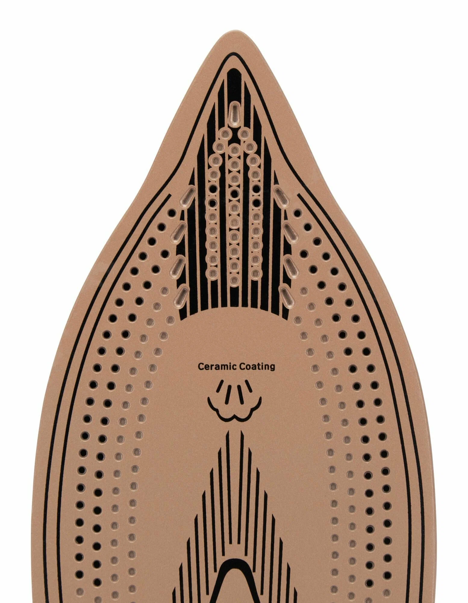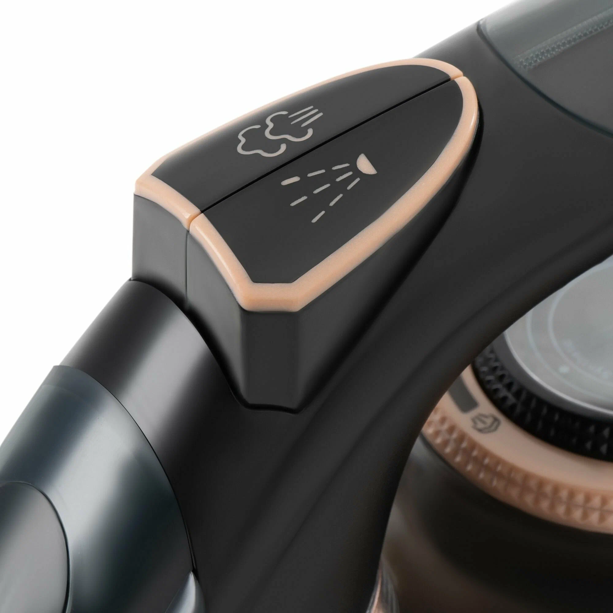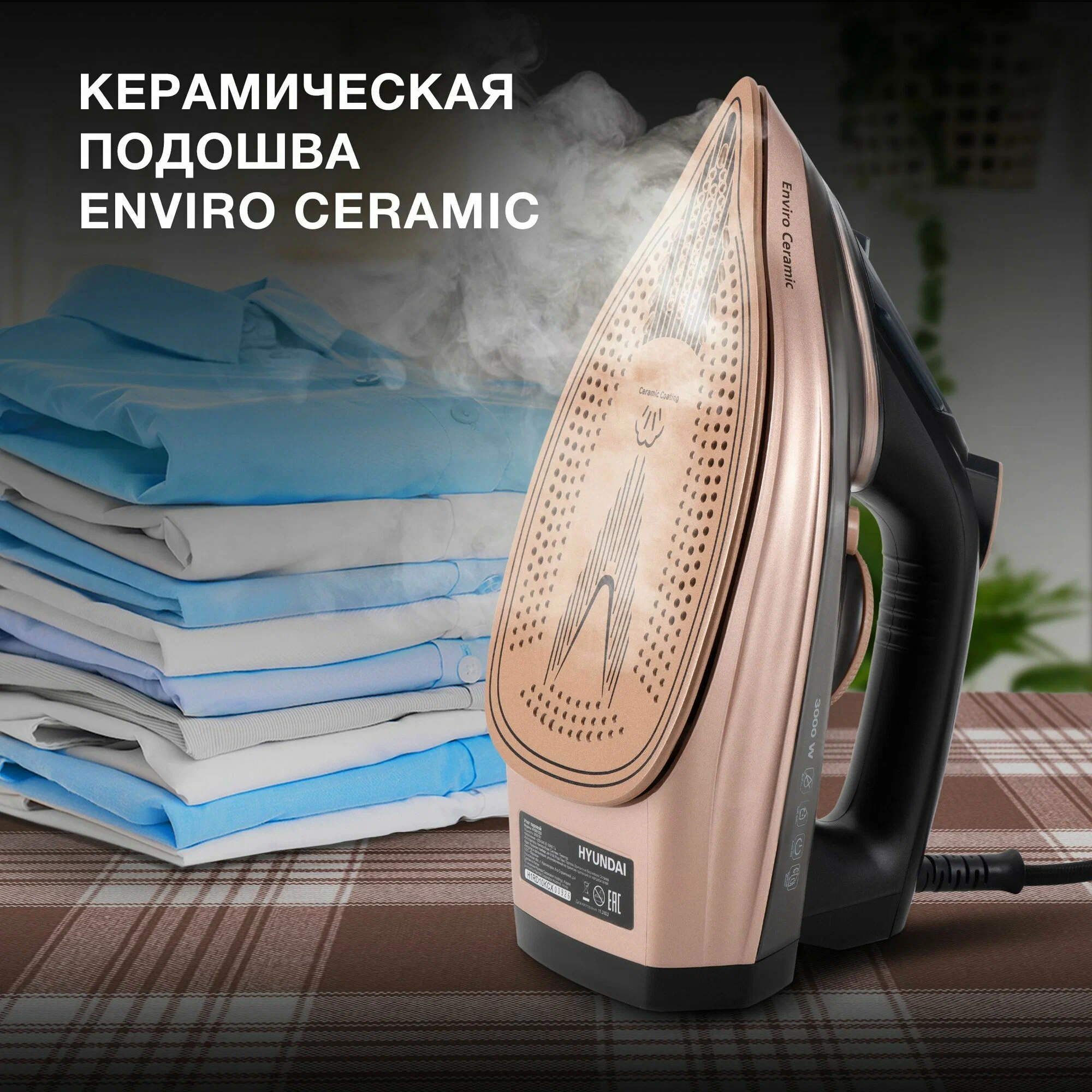 Прибор может работать в четырех температурных режимах, чтобы даже привередливая ткань под его воздействием не портилась. Максимальная мощность данной модели – 3000 Вт, но его подошва изготовлена из качественной керамики Enviro Ceramic, поэтому равномерно нагревается и обеспечивает бережную глажку. Утюг также оснащён удобной функцией – парогенератором с возможностями вертикальной обработки, пароувлажнения и опцией «паровой удар» для особенно сложной одежды. Во время него прибор единовременно испаряет до 220 г жидкости под давлением. Ёмкость резервуара для воды составляет 380 мл, для её удобного и быстрого заполнения в комплекте с Hyundai H-SI01222 поставляется мерный стакан с эргономичным носиком, предотвращающим разлив. Также утюг оснащён и стандартным распылителем, чтобы увлажнять ткань и легче её разглаживать.