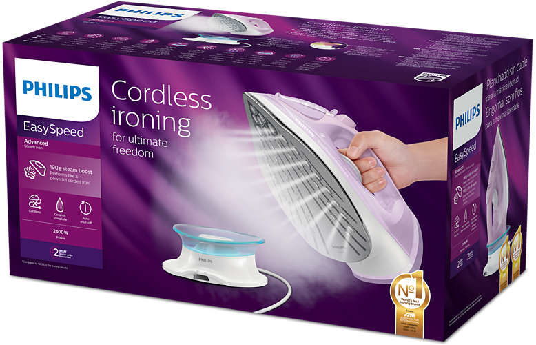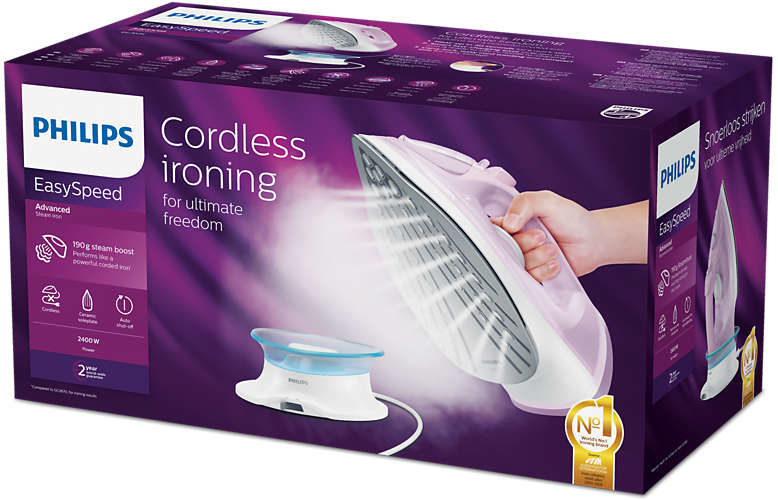 Особенности: Интеллектуальная база позволяет зарядить аккумулятор утюга за секунды. Цветной индикатор оповещает о готовности утюга к работе, а также напоминает о необходимости зарядки.