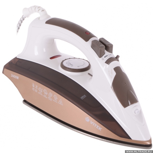 пароувлажнение; мощность: 2400Вт; паровой удар: 140г; емкость для воды: 280мл; подошва: Ceramic UltraCare; самоочистка от накипи; автоотключение; цвет: белый и коричневый