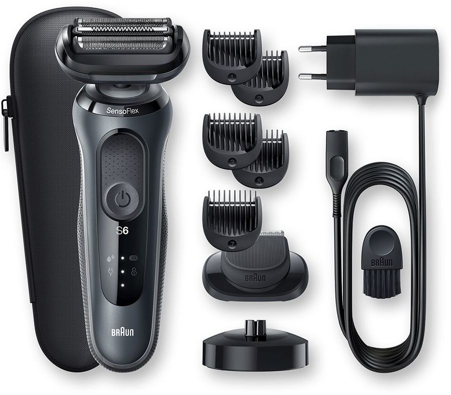 Комплектация 5 гребней, насадка-триммер, дорожный чехол, подставка для зарядки, щеточка для чистки, зарядное устройство