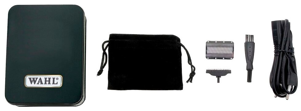дополнительная (запасная) сетка и режущий блок; мягкий бархатный футляр; жесткая металлическая коробка; щеточка для чистки; шнур для зарядки