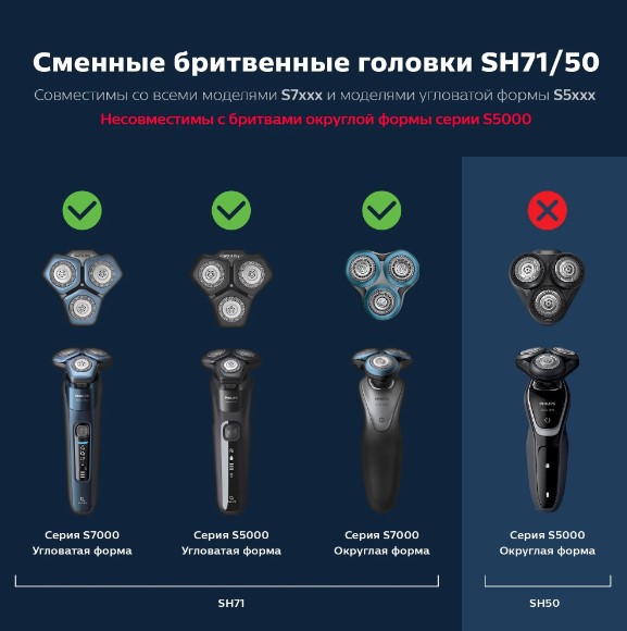 Сменные головки SH71 совместимы со всеми бритвами серии 7000 (S7xxx) и бритвами угловатой формы серии 5000 (S5xxx).