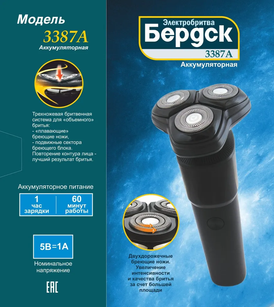 Электробритва "БЕРДСК" модель 3387А - электроприбор личной гигиены, предназначенный для сухого бритья. Прибор предназначен для использования в домашних условиях.