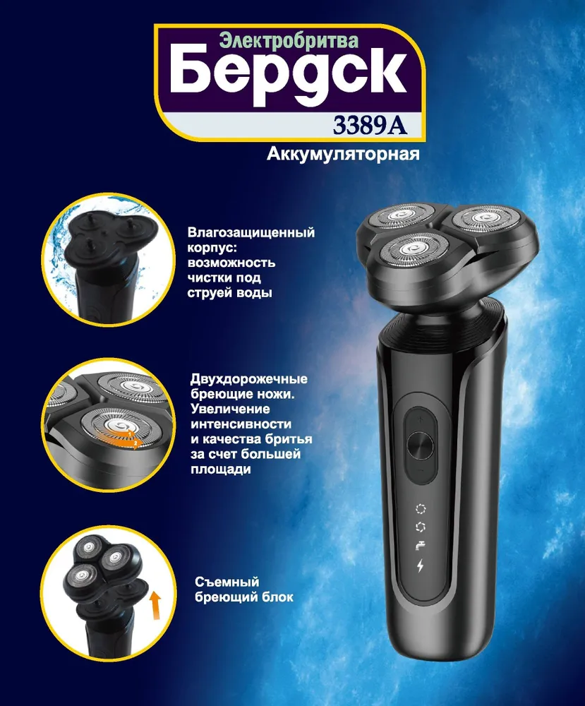 Электробритва "БЕРДСК" модель 3389А - электроприбор личной гигиены, предназначенный для сухого бритья. Прибор предназначен для использования в домашних условиях. Прибор состоит из корпуса и насадки. В зависимости от установленной насадки может быть использован в качестве электробритвы, триммера для висков, триммера для носа, щетки для лица.