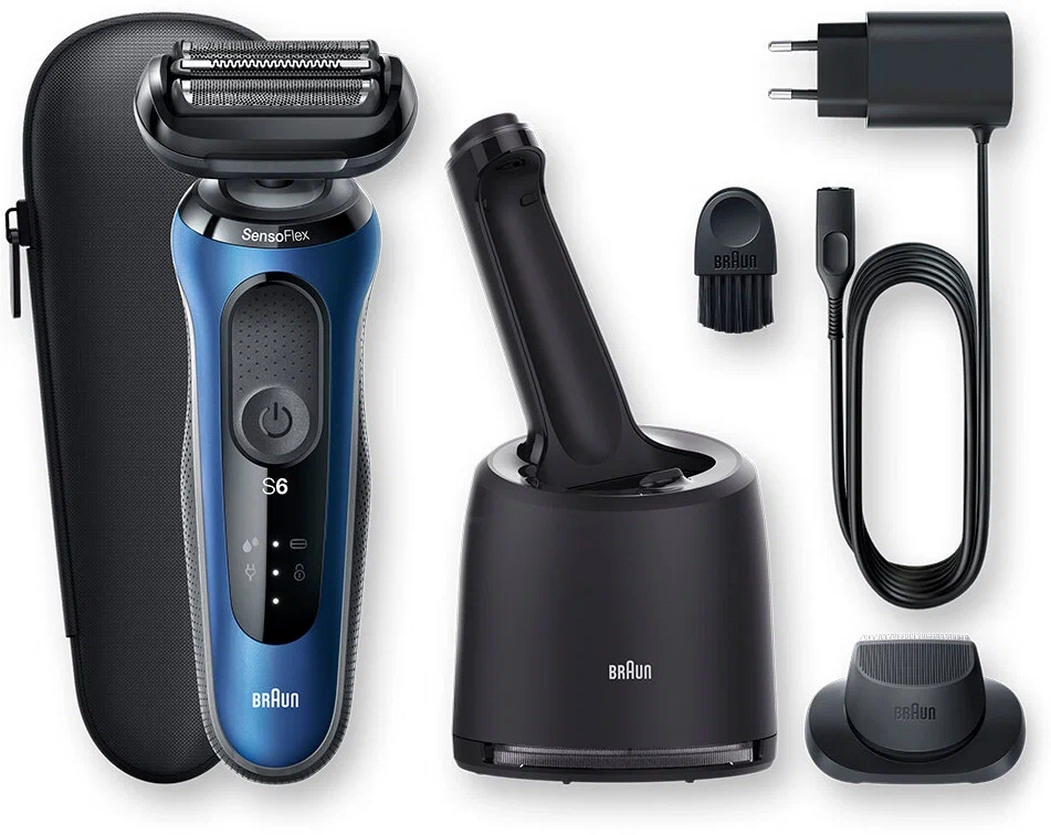 бритва, насадка-триммер, дорожный чехол, станция, щеточка для чистки, зарядное устройство