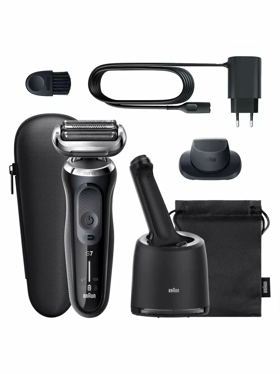 Бритва, станция подзарядки, щеточка для очистки, провод для зарядки, насадка-триммер, чехол, дорожный футляр