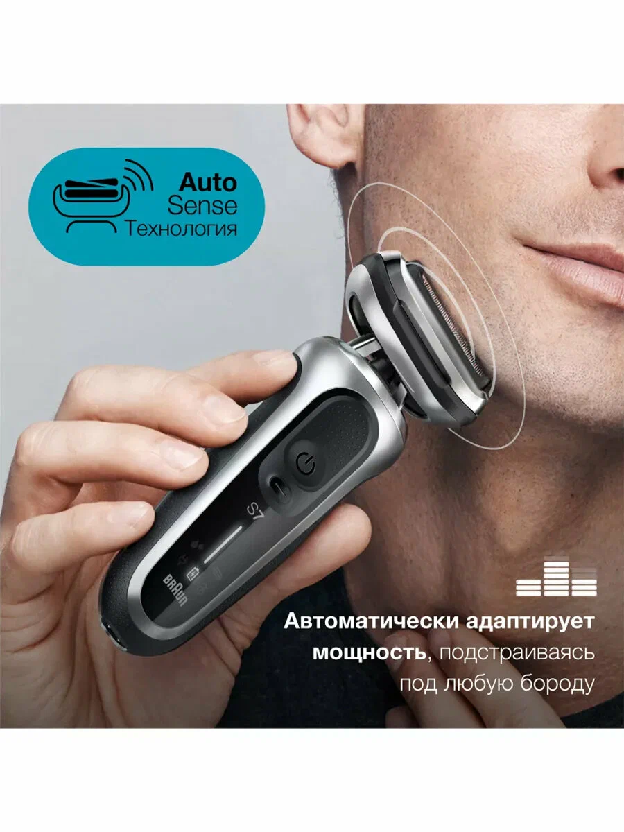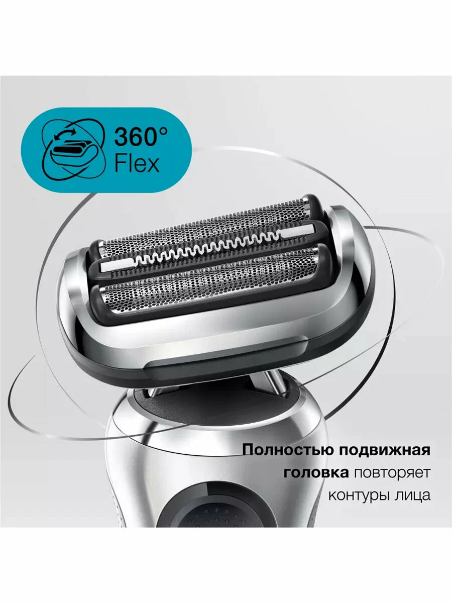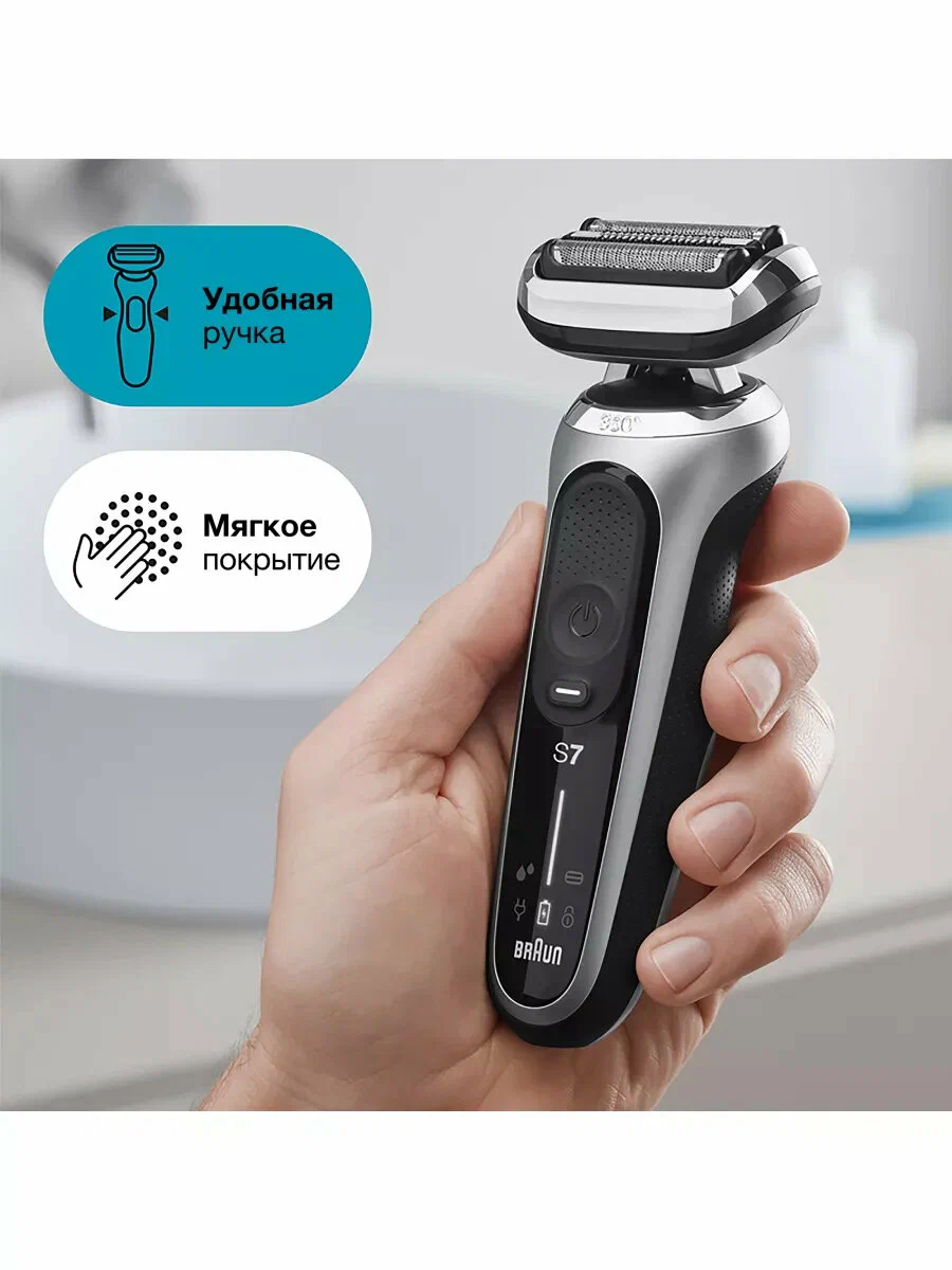 Режущий блок 73S; Индикация включения; Промывка ножей под водой; Повторение контуров лица; Использование в душе; Прорезиненное покрытие корпуса; Светодиодный дисплей; Насадок - 1 шт.